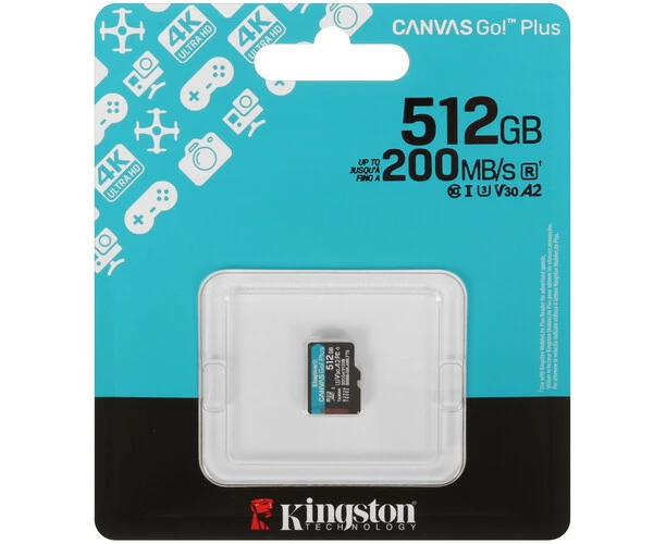 Карта памяти Kingston Canvas Go! Plus microSDXC 512 ГБ [SDCG4/512GBSP] подходит для использования в экстремальных условиях и соответствует классам скорости A2, Class 10, UHS Class 3 и Video Class 30. Изделие предназначено для смартфонов, фотокамер и других устройств.