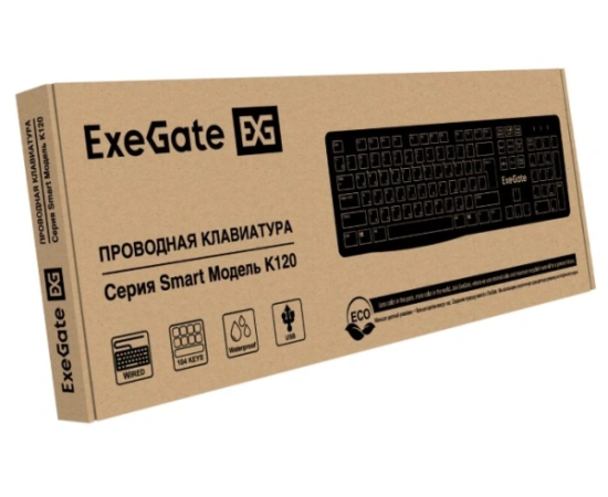 Клавиатура Exegate Smart K120 EX298364RUS USB, полноразмерная, влагозащищенная, 104кл, Enter большой, длина кабеля 1,6м, черная, RTL
