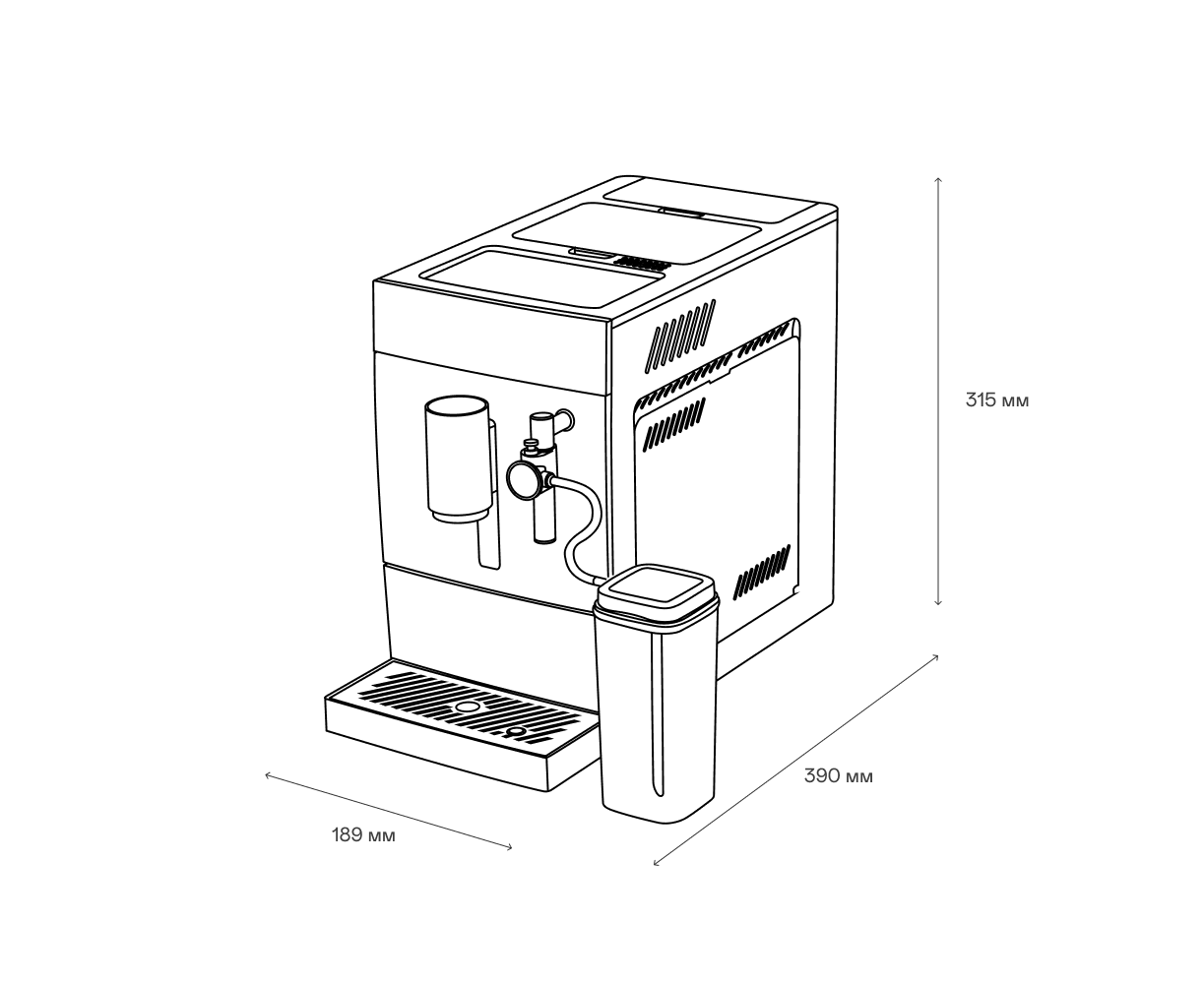 Кофемашина - 1 шт.; Резервуар для молока - 1 шт.; Крышка кофемолки с уплотнителем - 1 шт.; Соединительная гибкая трубочка для подачи молока - 1 шт.; Устройство вспенивания молока - 1 шт.; Щёточка для очистки - 1 шт.; Руководство пользователя - 1 шт.; Краткая инструкция пользователя - 1 шт.