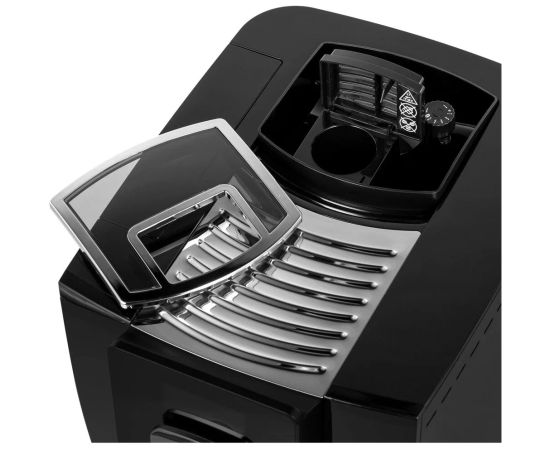Машина может приготовить капучино с помощью одной кнопки и оснащена LCD-дисплеем и поворотным регулятором для выбора помола, крепости кофе, температуры воды, объема кофе, а также объема, температуры и текстуры молока.