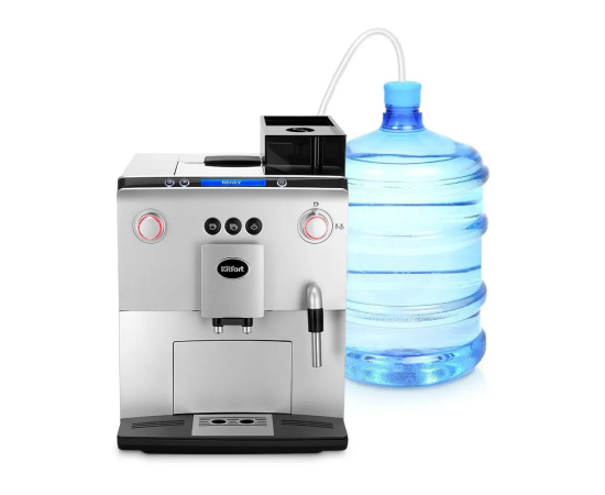 Кофемашину можно подключить к внешнему источнику воды без напора. Это может быть очень удобно при использовании бутилированной питьевой воды, например, в больших бутылях по 19 литров. Так вам не придется переливать воду и наполнять резервуар для воды.
