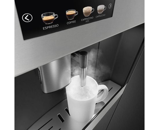 Кофемашина Smeg CMS4303X из коллекции Classica выполнена в цвете «Нержавеющая сталь». Покрытие против отпечатков пальцев максимально упрощает уход за внешним видом устройства. Управление осуществляется с большого цветного TFT-дисплея, с помощью которого можно выбрать один из 13 запрограммированных напитков, настроить крепость, количество или температуру кофе или настроить пользовательский профиль для каждого из членов семьи.