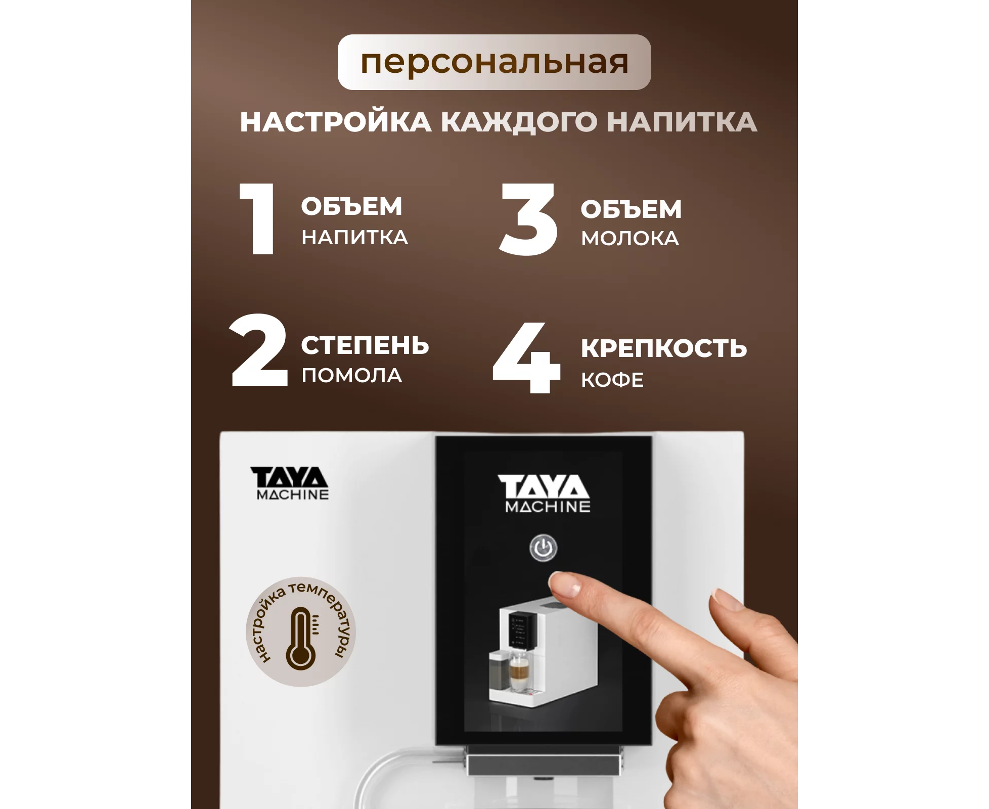 Кофемашина TAYA machine R5 имеет возможность выбора объема напитка и сохранения новых параметров в памяти кофемашины.