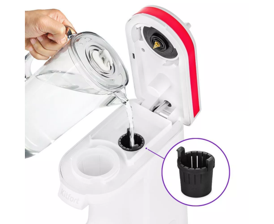 Резервуар для воды несъёмный. Чтобы наполнить его водой, откройте крышку и залейте от 100 до 360 мл воды. В отверстие для добавления воды вставлен многоразовый фильтр, который предотвращает попадание кофе или других предметов в резервуар.