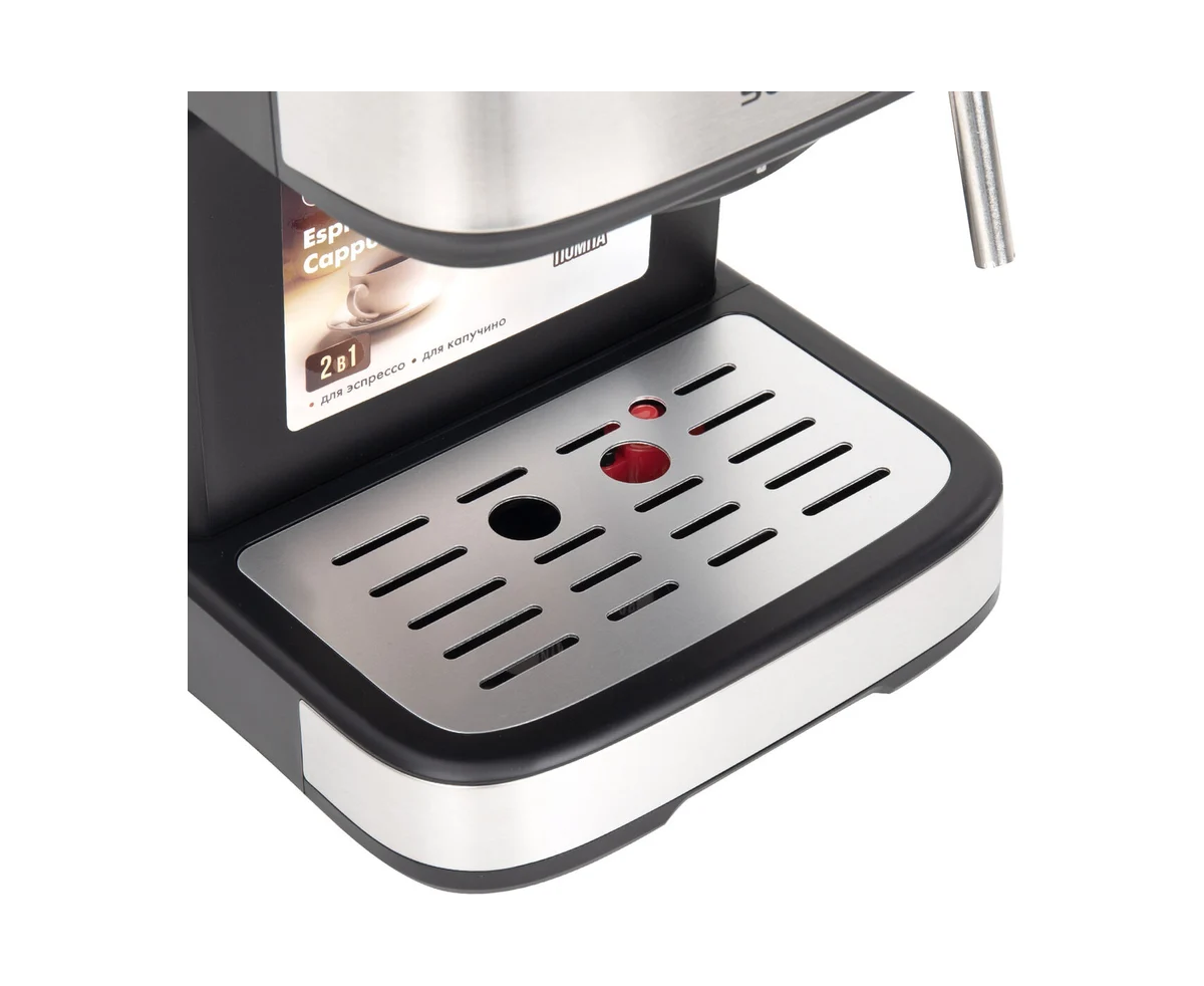 Кофеварка оборудована поддоном для сбора капель со съёмной решёткой из нержавеющей стали – его легко мыть и устанавливать обратно. В поддоне есть специальный поплавок: если он наполнится водой, поплавок поднимется выше решётки.