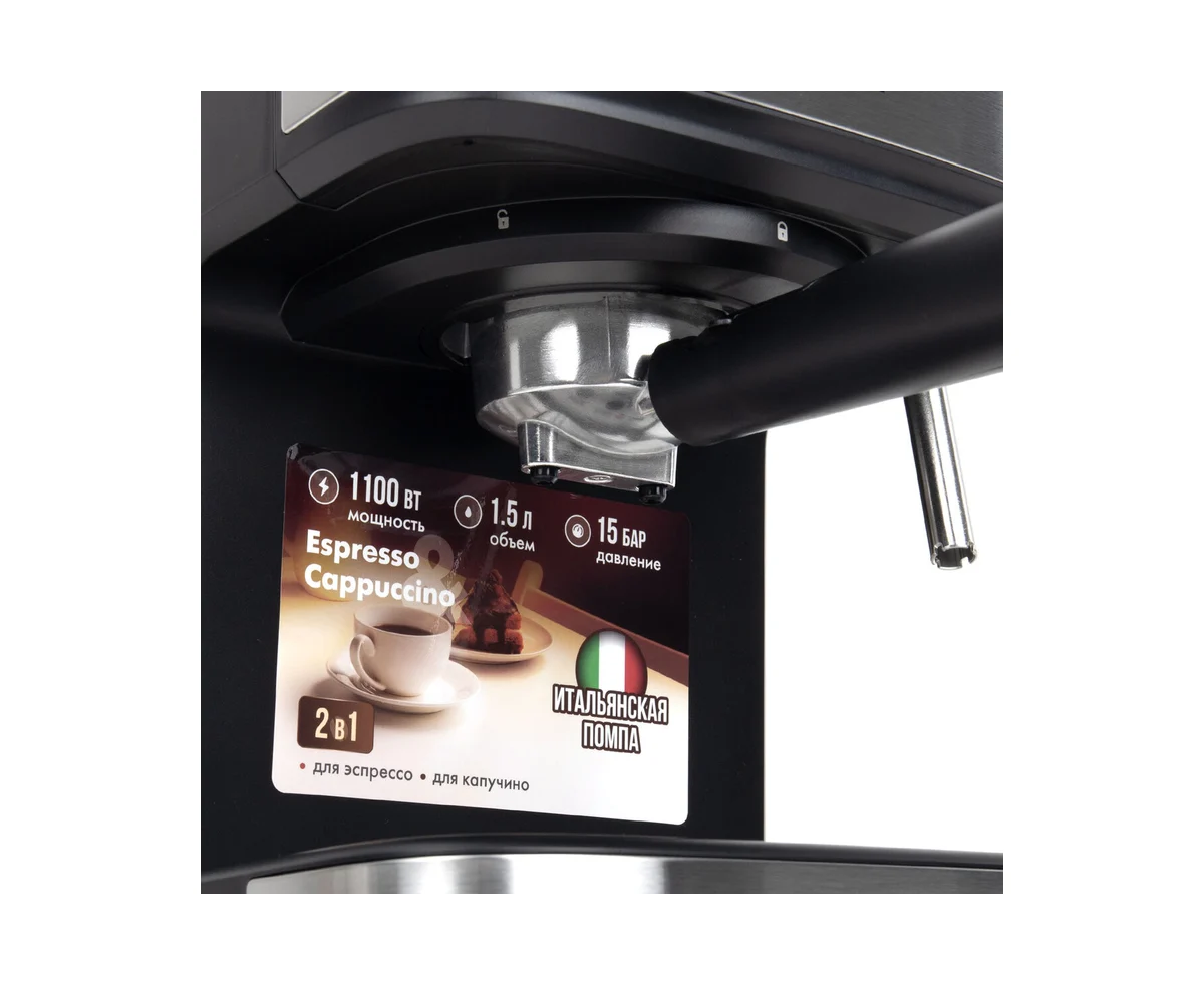 Кофеварка рожковая SONNEN CM8501 (456335) ручной капучинатор 1100Вт, 1,5л, 15 бар, черная/серебро