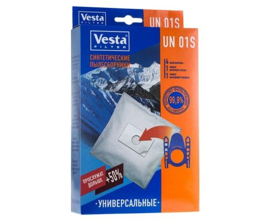 Мешки для пылесосов Vesta filter UN01S для ЛЮБЫХ бытовых пылесосов. Мешки с клейкой основой , используются в случае наличия рамки от оригинального мешка, которую потребуется приклеить на мешок из набора UN 01 S. Произведены из синтетического микроволокна, обладают высокоэффективным качеством фильтрации в 99.9 % (0.3 микрон), обеспечивают очистку воздуха выходящего из пылесоса. Благодаря синтетическому материалу мешки VESTA FILTER UN 01S не боятся воды и острых предметов, сохраняют мощность пылесоса при заполнении, вмещают в себя больше содержимого чем мешки из бумаги. В комплектацию входят 4 пылесборника , 1 фильтр моторного отсека и 1 фильтр выходящего воздуха.