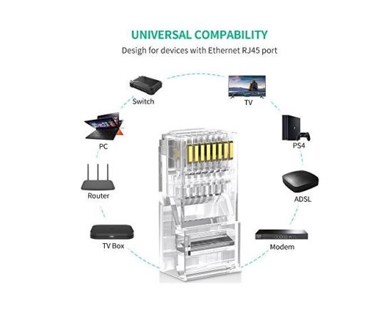 Коннектор Ugreen NW110 RJ-45 Connector разработан специально для патч-кабелей UTP / кабелей CAT.5e, Cat5.