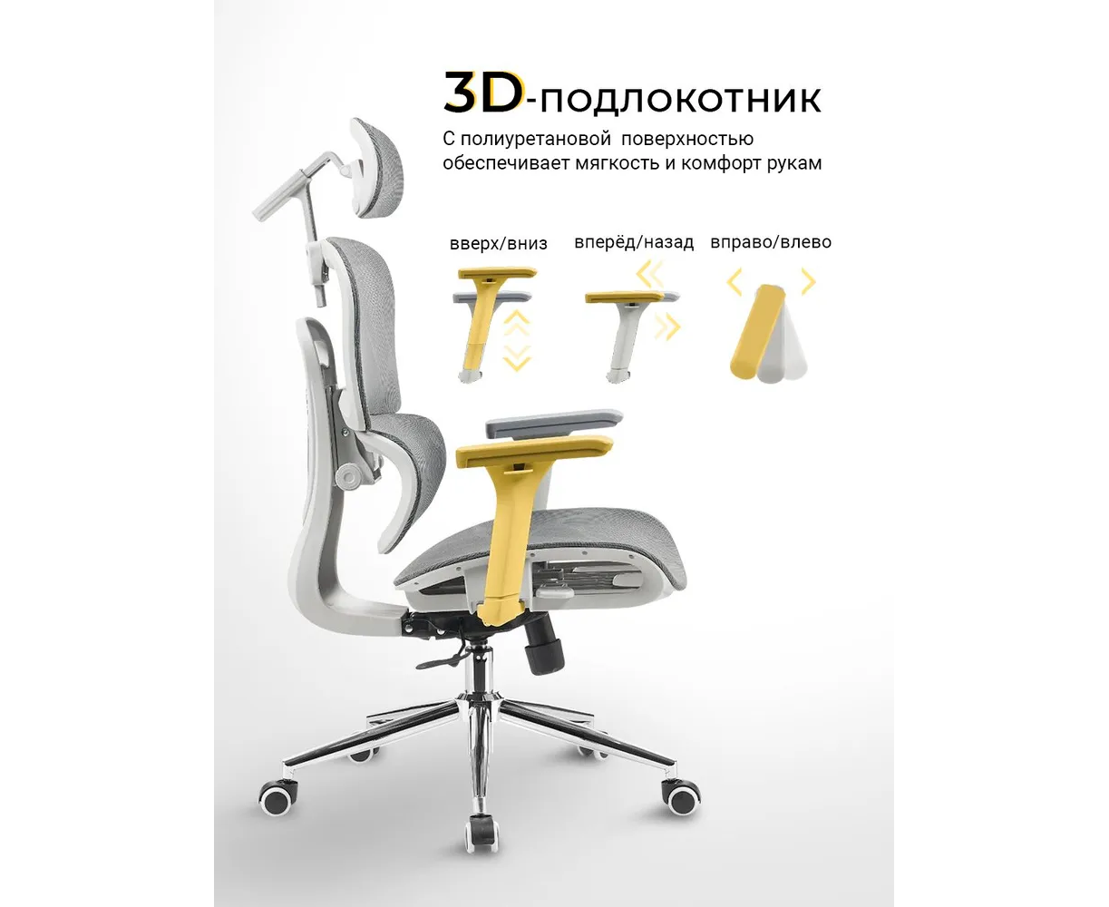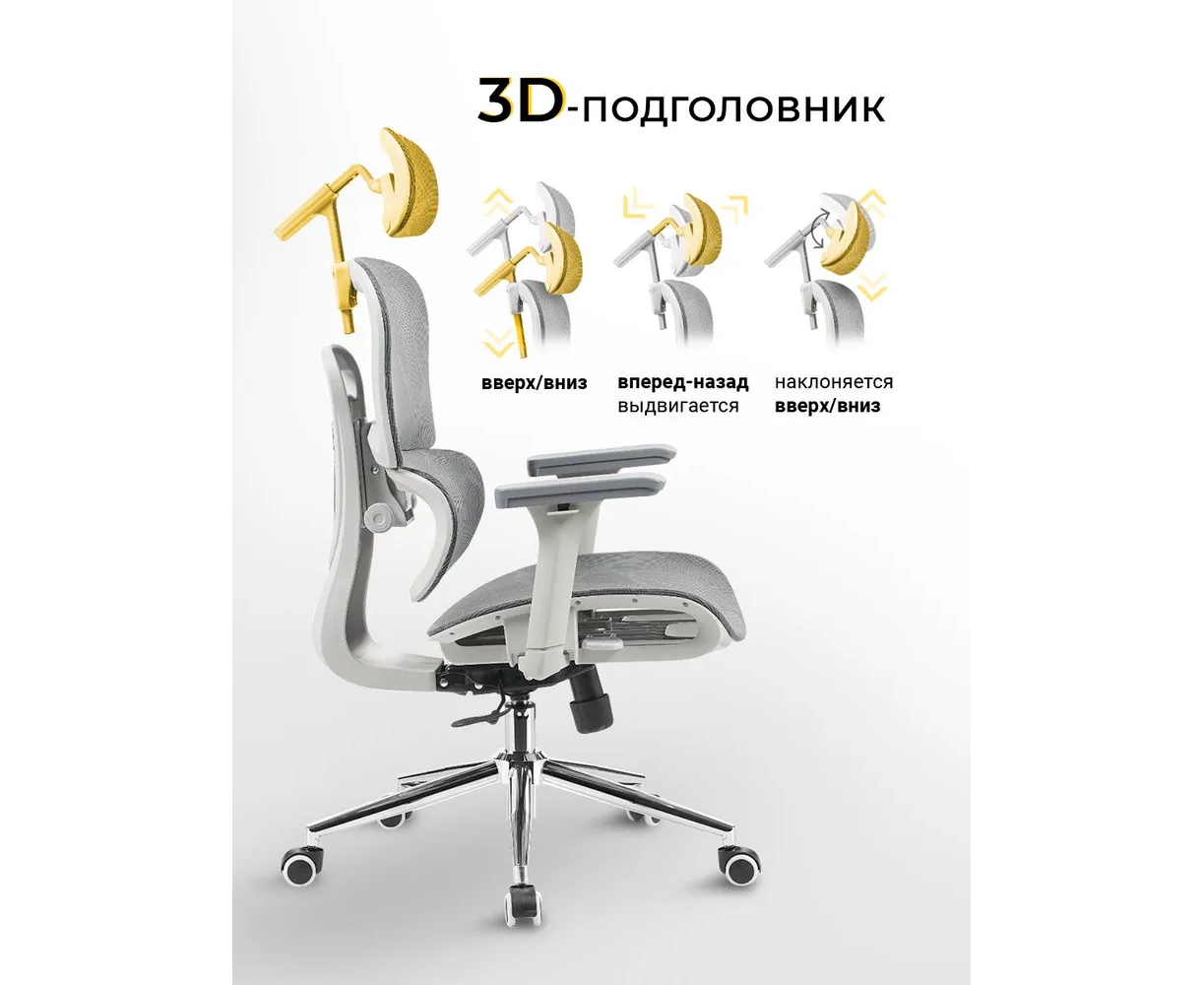 Особенности: На колесиках, Поддержка поясницы, Регулировка по высоте, Регулировка по глубине, Регулируемая спинка, Регулируемые подлокотники, Регулируемый подголовник, С подголовником, С подлокотниками