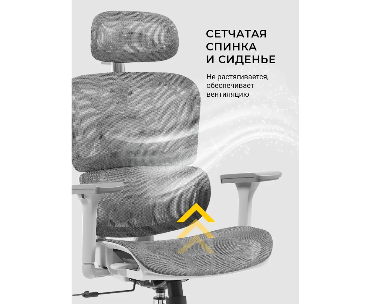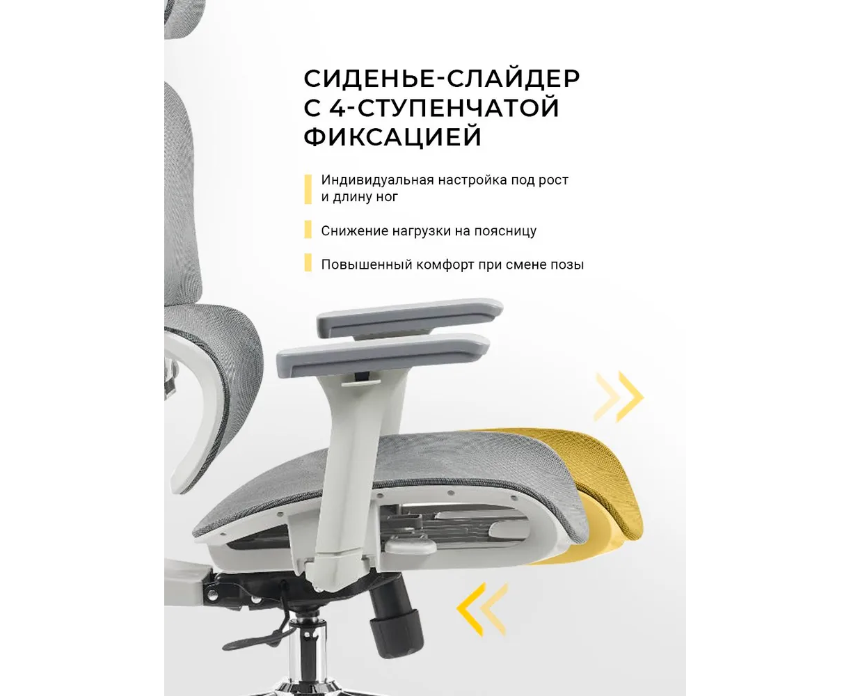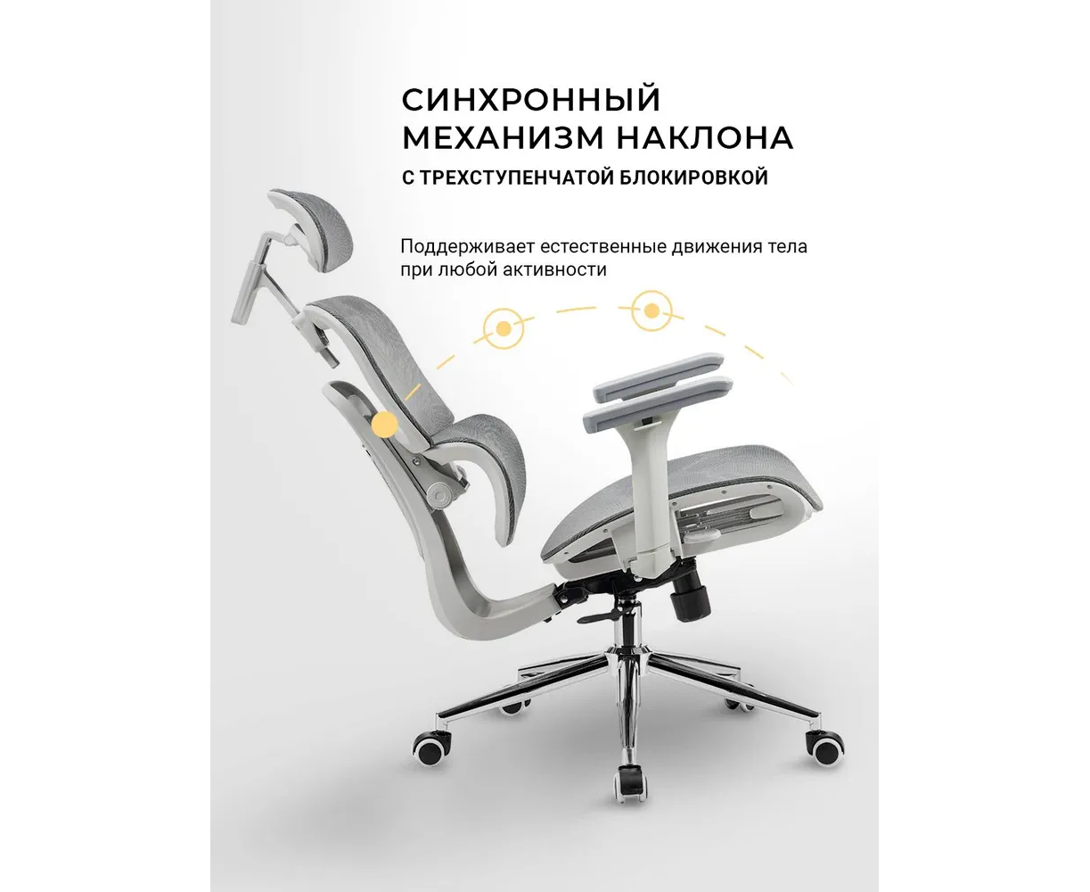 Регулировка: Угла наклона спинки, Глубины сиденья, Угла подлокотников, Высоты подлокотников, Высоты спинки, Высоты поясничного упора, Высоты подголовника, Угла наклона подголовника