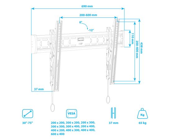 VESA: 200x100, 200x300, 200х200, 300x300, 400x200, макс. 400x400, макс. 600x400