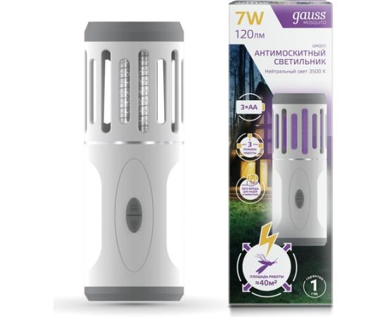 Антимоскитный светильник GAUSS Mosquito, 7 Вт, 3 AA, 1/40 GMQ03 – световое устройство, которое защищает от летающих насекомых как внутри помещения, так и снаружи, например, в беседке, террасе или туристической палатке.