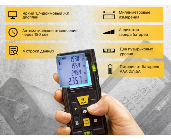 Дальномер оснащен лазером, который позволяет измерять расстояния на удалении до 40 метров с трехмиллиметровой точностью