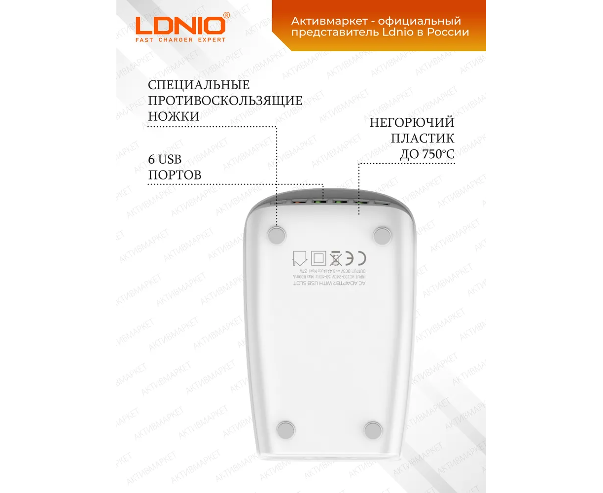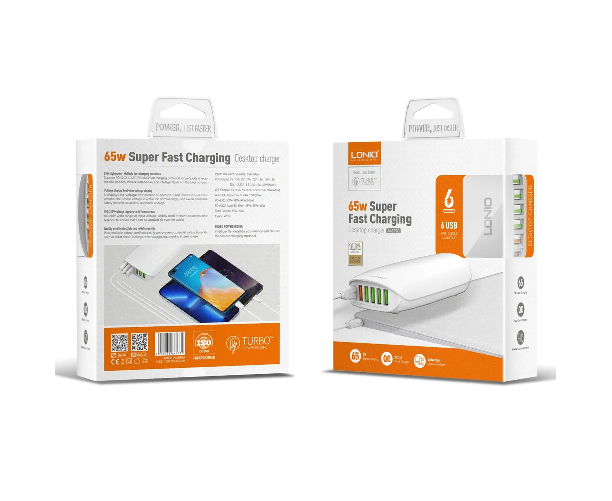 Сетевое зарядное устройство LDNIO A6573C - это стильная и качественная настольная зарядная станция для мобильных устройств. Устройство имеет шесть USB выходов: один TYPE-C с поддержкой протокола быстрой зарядки PD и пять TYPE-A: 4 USB порта (зеленого цвета) поддерживают обычную зарядку с технологией Auto ID, 1 порт (красного цвета) поддерживает функцию быстрой зарядки Quick Charge 3.0. Технология Auto-ID позволяет автоматически определять подключенное устройство и заряжать его максимальным током - это существенно сокращает время зарядки. Входное напряжение - от 100 до 240 В. Выходные параметры: PD:5V-3A,9V-3A,12V-3A ,15V-3A,20V-3.25A (65W Max), QC 3.0: 5V-3A,9V-2A,12V-1.5A (18W Max). Максимальная мощность – 65 Вт. LDNIO A6573C имеет многоуровневую систему защиты: от повышенного тока, от повышенного напряжения, от короткого замыкания, от перегрева. Корпус устройства изготовлен из высококачественного негорючего пластика (до 850 гр. C).