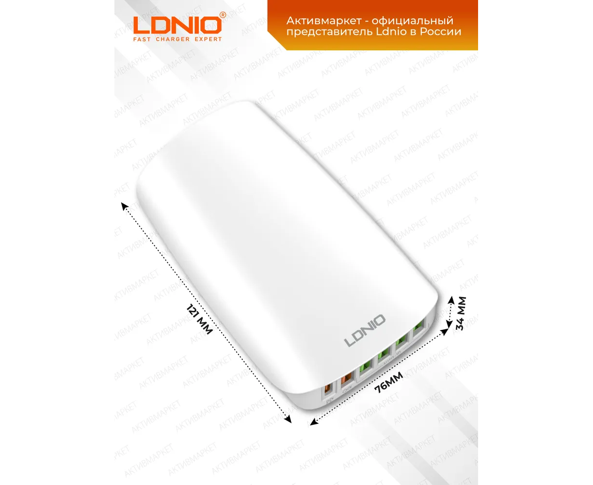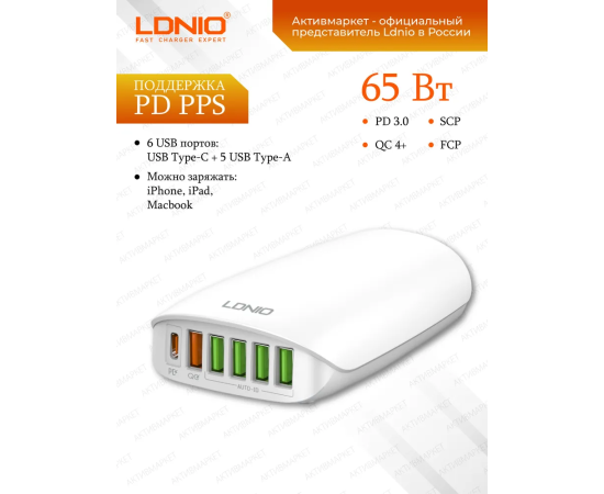 LDNIO A6573C/ Зарядная станция на 6 USB: USB Type-C + 5 USB Type-A/ Выход: 3.3-20V, max 65W/ Белый, (Арт. LD_C3467)