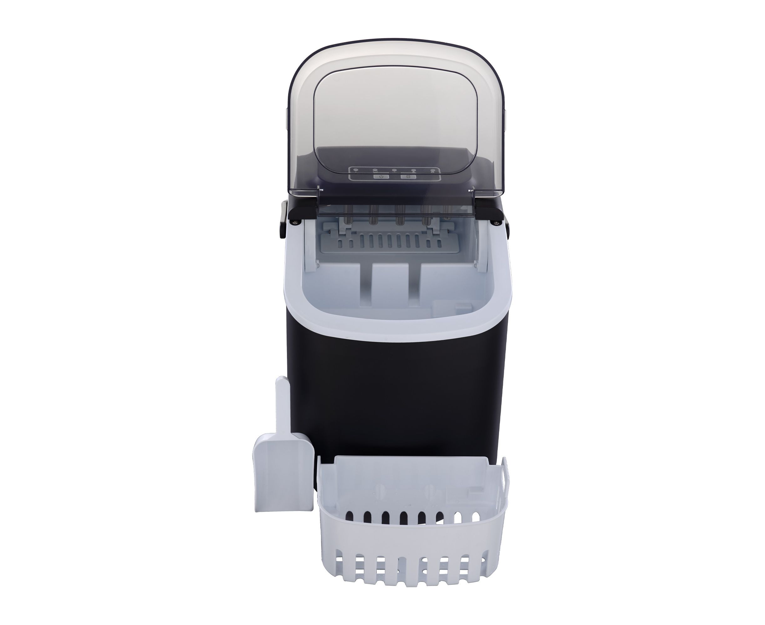 Пользоваться прибором легко: на панели управления расположены кнопки, а также индикаторы выбранного размера льда, питания и заполнения корзины.