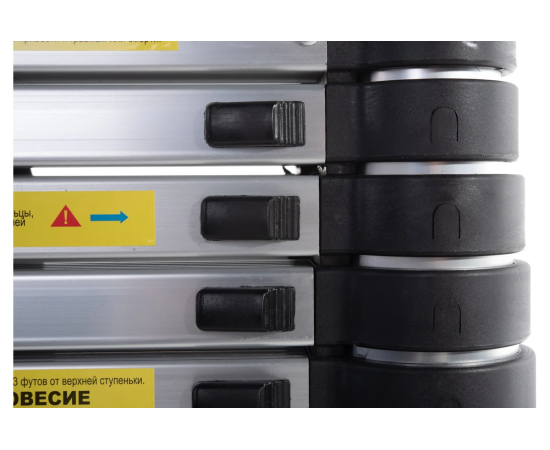 Особенности лестницы: каждая ступень (кроме первой) имеет с двух сторон фиксаторы, шаг регулировки по высоте -300мм., компактная в сложенном виде, фиксация ступеней в сложенном виде-ремнем, может использоваться как приставная лестница и как стремянка.