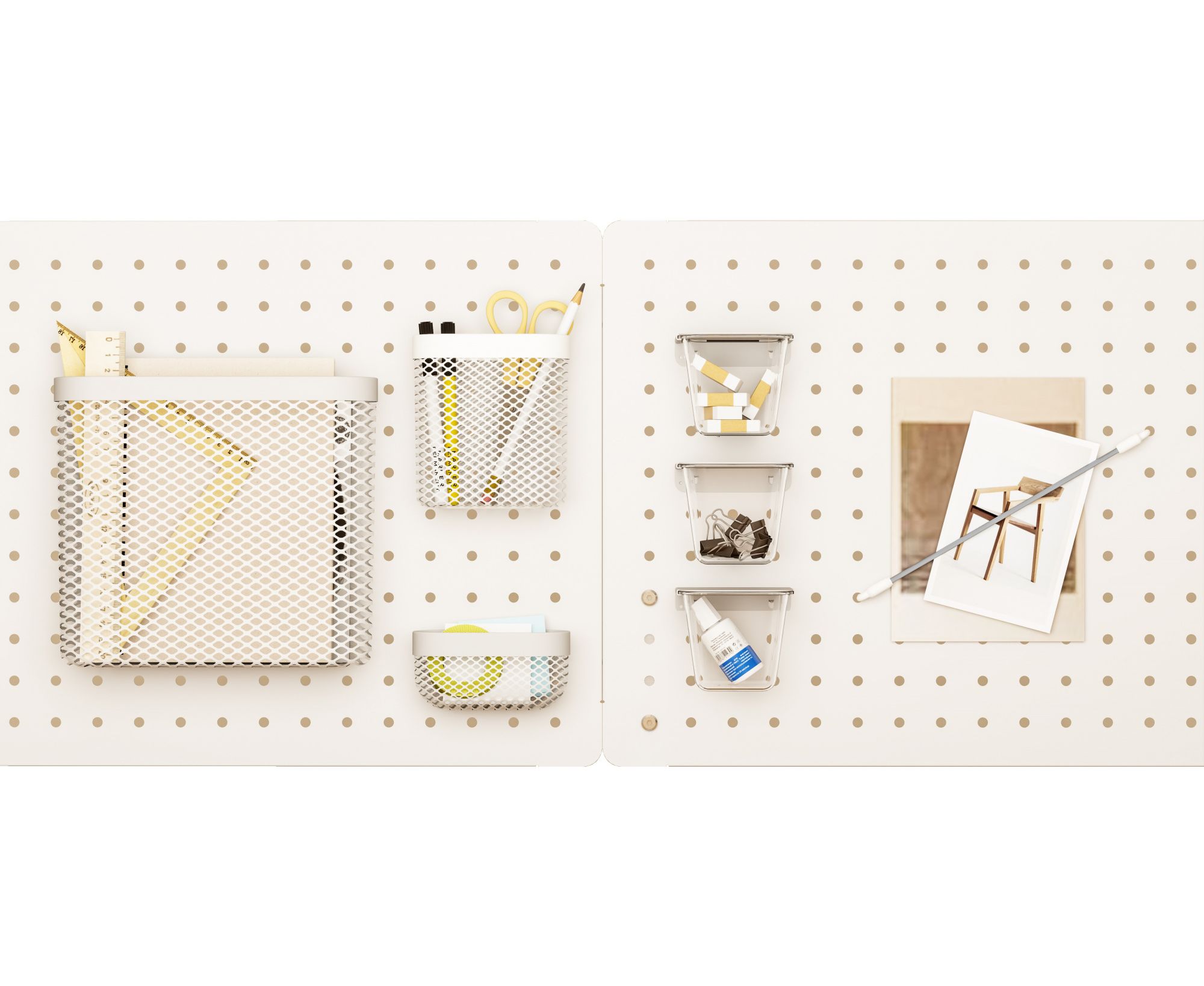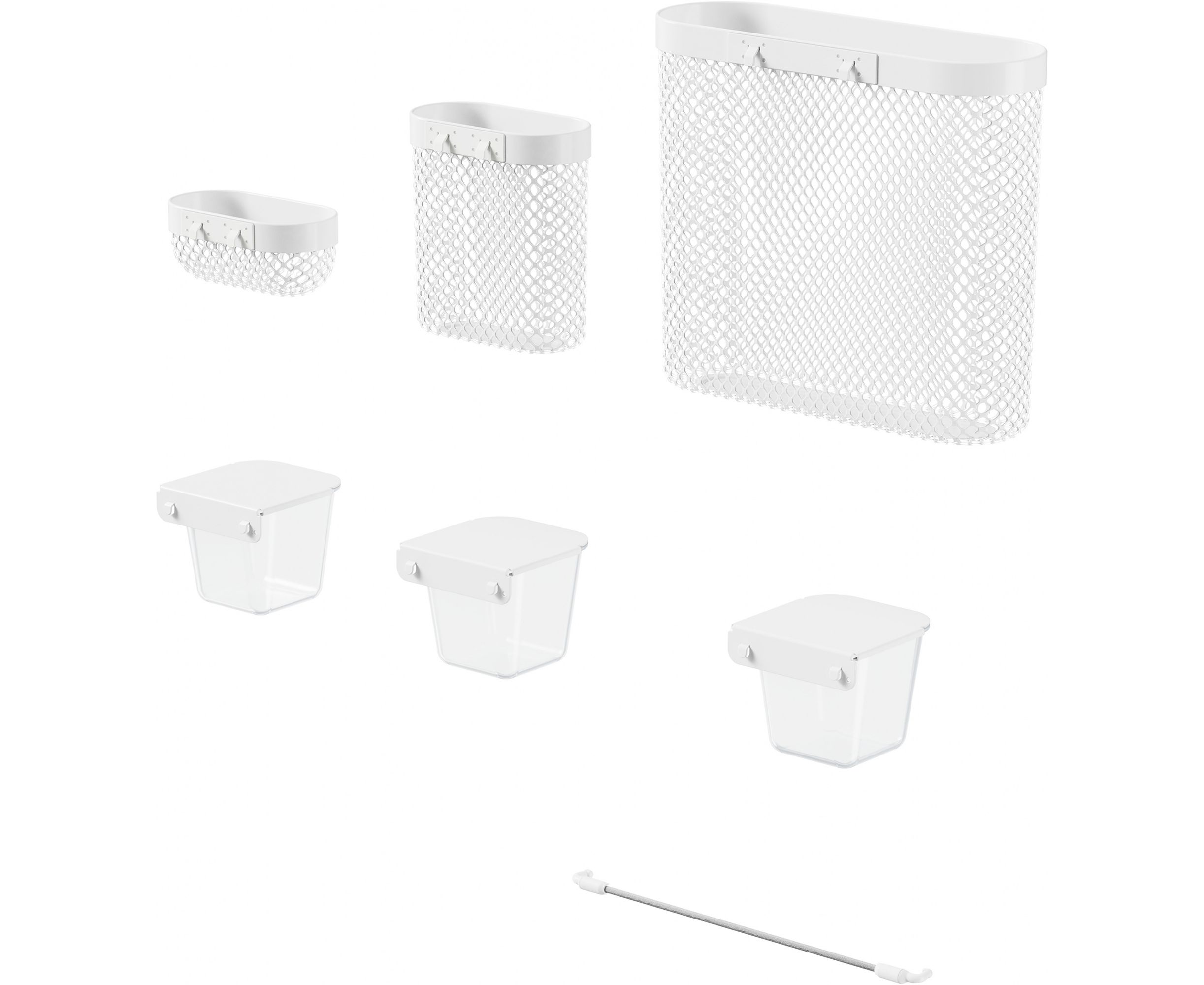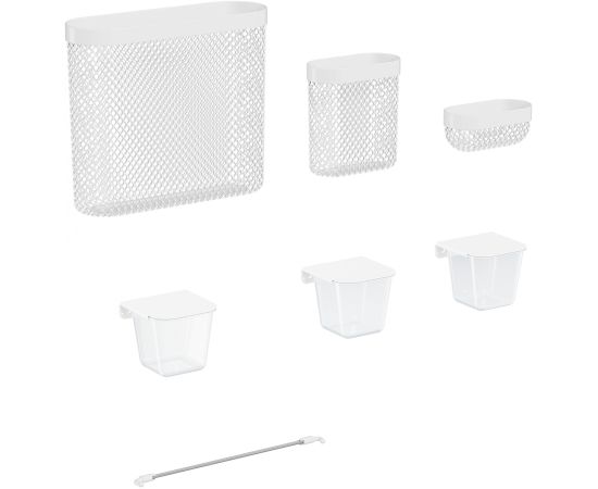Набор аксессуаров CS-PB-SET1 станет идеальным дополнением к перфорированному органайзеру Cactus. Сетчатые корзины разных размеров, закрывающиеся пластиковые контейнеры для различных мелочей и держатель для заметок – для сохранения порядка на рабочем месте в офисе или дома. Аксессуары легко и надёжно крепятся к панели, имеют универсальный белый цвет, который органично впишется в интерьер.
