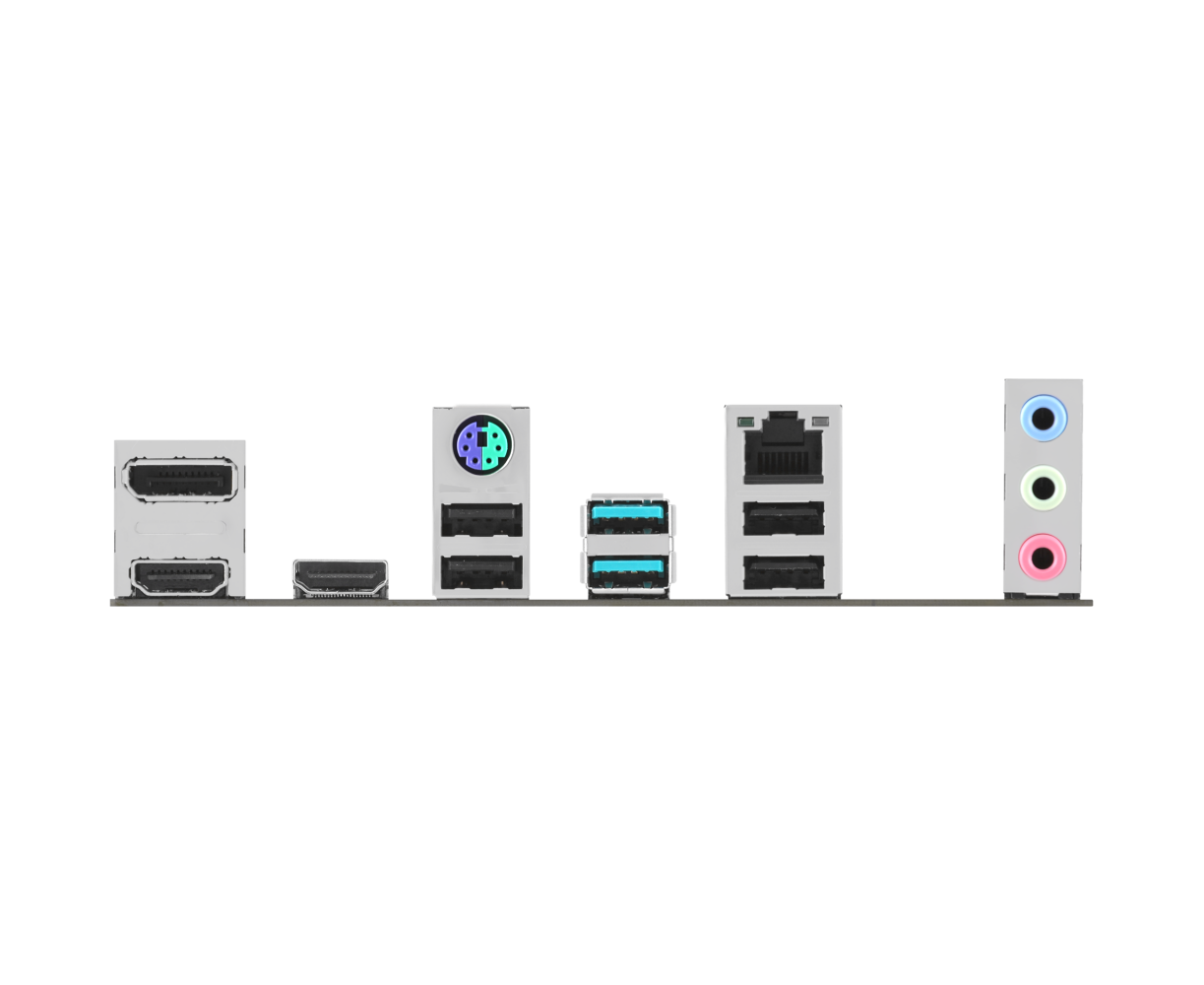PS/2, 4 x USB 2.0, 2 x USB 3.2 Gen2, 2 x HDMI, DisplayPort, RJ-45