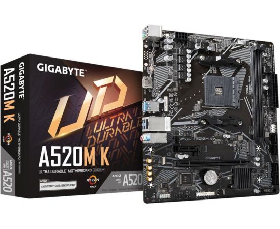 MB sAM4 Gigabyte A520M K V2, Socket AM4, AMD A520, 2xDDR4-3200, D-SUB+HDMI, 1xPCI-Ex16, 1xPCI-Ex1, 4xSATA3(RAID 0/1/10), 1xM.2, 8 Ch Audio, GLan, (2+4)xUSB2.0, (4+2)xU