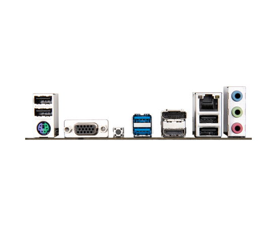 PS/2, 4 x USB 2.0, 2 x USB 3.2 Gen1, VGA, HDMI, DisplayPort, RJ-45