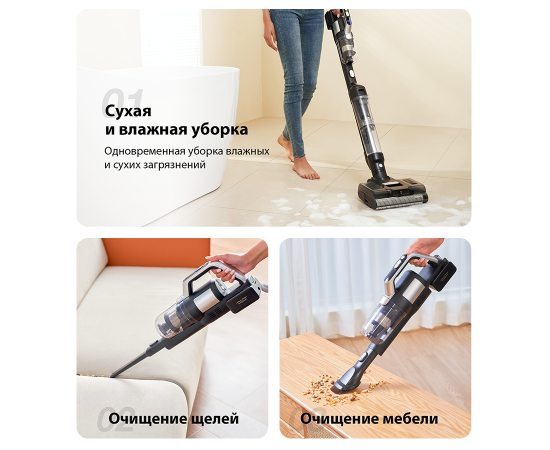 Преимущества Мощность всасывания 100 аВт, Самоочистка и сушка горячим воздухом, Съемный аккумулятор, Двигатель IPX8 мощностью 400 Вт, Комплектация 3 в 1, Портативная конфигурация для уборки мебели