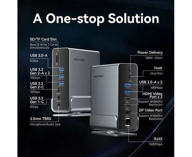 USB-C F / OTG USB 3.2 Gen 2-C F / OTG USB 3.2 Gen 2-A F x 2 / OTG USB 3.2 Gen 1-C F / OTG USB 3.0-A F / OTG USB 2.0-A F x 2 / USB PD CF / HDMI 19F x 2 / RJ45 F / TF F / SD F / mini-jack F(TRRS OMTP/CTIA) / DP F