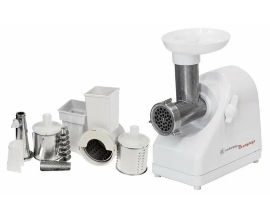 защита от перегрузки, мытье в посудомоечной машине, отсек для сетевого шнура, отсек для хранения насадок, прорезиненные ножки, Номинальная мощность 220 Вт.Время непрерывной работы 5 мин, насадки для приготовления колбас, система реверса, толкатель