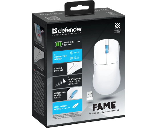 Стильная и удобная игровая беспроводная мышь с уникальными особенностями. Вес мыши всего 66 грамм, что может обеспечить игроку значительное преимущество в шутерах от первого лица. Максимальное разрешение 10 000 dpi. Мышь имеет 2 режима подключения: по Bluetooth или по радио-каналу 2.4ГГц (через USB-адаптер). Встроенный аккумулятор на 300 мАч обеспечивает до 100 часов работы мыши.