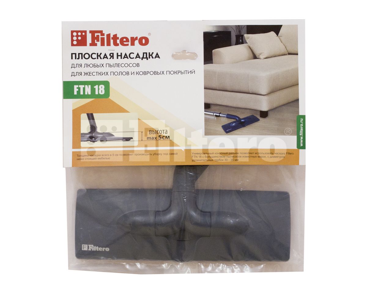Насадка Filtero FTN 18 с шириной рабочей зоны 30 см. Конусный соединитель позволяет использовать насадку с большинством пылесосов известных марок, с диаметром удлинительной трубки 30-35 мм.