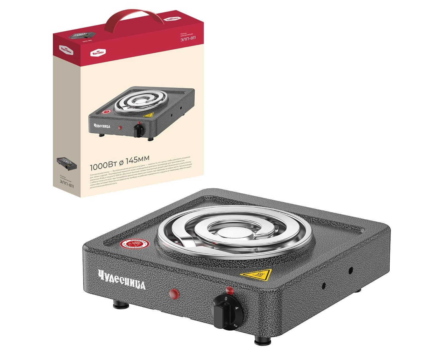 Плитка электрическая Чудесница ЭЛП-811 с 1-й конфоркой, цвет черный, мощность 1000 Вт, толстый спиральный нагревательный элемент из высококачественной стали, регулировка температуры, прочное легкоочищаемое термостойкое эмалевое покрытие, защита от перегрева, световой индикатор работы