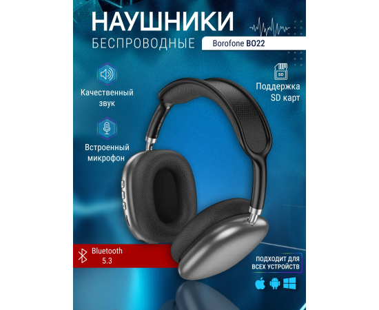 Наушники bluetooth полноразмерные BOROFONE BO22 Plus Elegant BT headphones (серый)