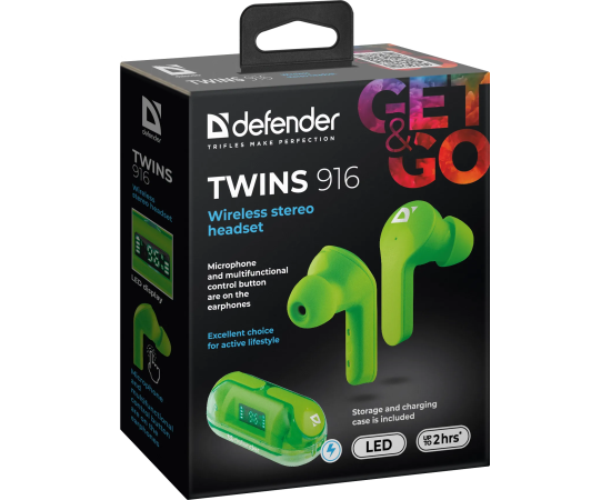 Беспроводная гарнитура DEFENDER Twins 916 зеленый, TWS, Bluetooth 63917