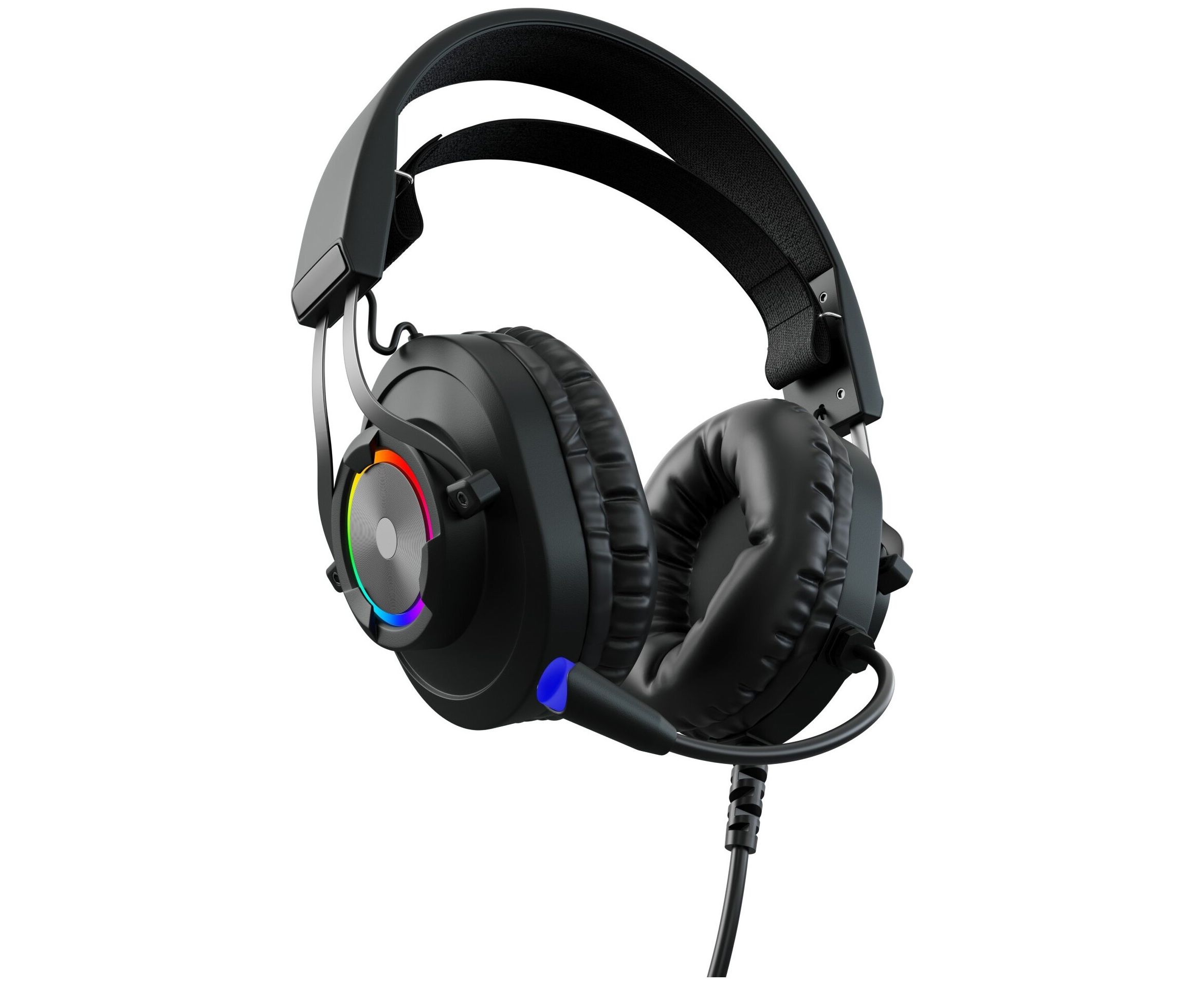 RGB подсветка; управление звуком и подсветкой на проводе; адаптивное оголовье; материал амбушюров - искусственная кожа