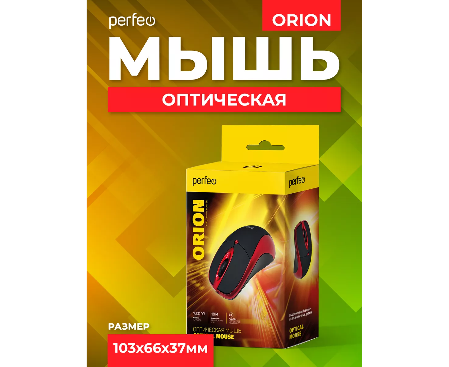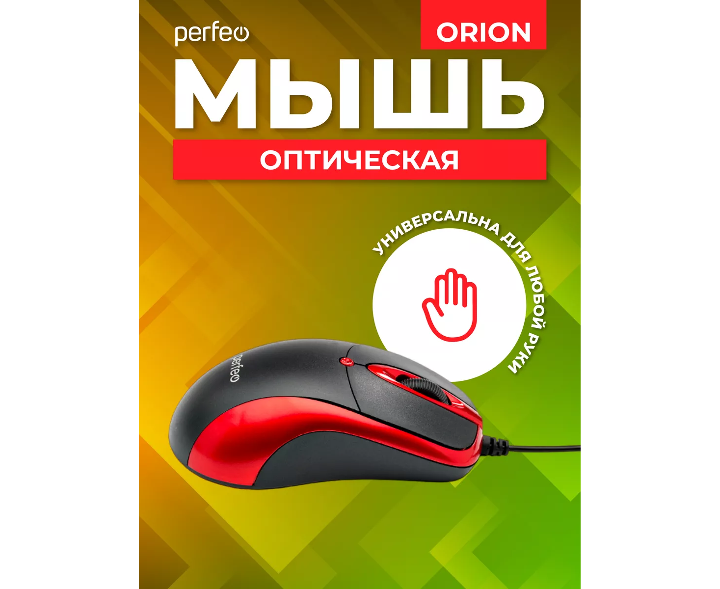 Оптическая мышь Perfeo "ORION", 3 кн, DPI 1000, USB, чёрный/красный