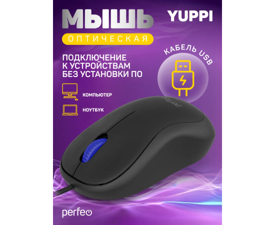 Модель Perfeo мышь оптическая, "YUPPI", бесшумная, 3 кн, кабель 1,8м, DPI 1000, USB, чёрн.
