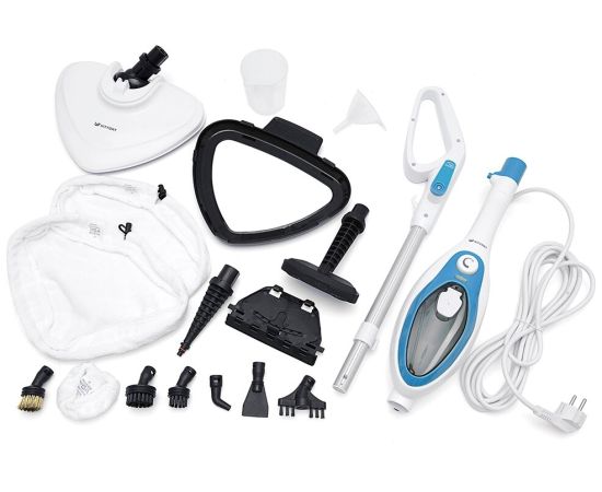 полная комплектация: щетка для пола, рамка для ковра, стакан для наливания воды, воронка, тряпка для пола - 2 шт., тряпка для отпаривания, круглая латунная щетка, большая и маленькая круглые нейлоновые щетки, угловая насадка, скребок, плоская ворсовая щетка, скребок для стекла, струйная насадка, насадка для отпаривания
