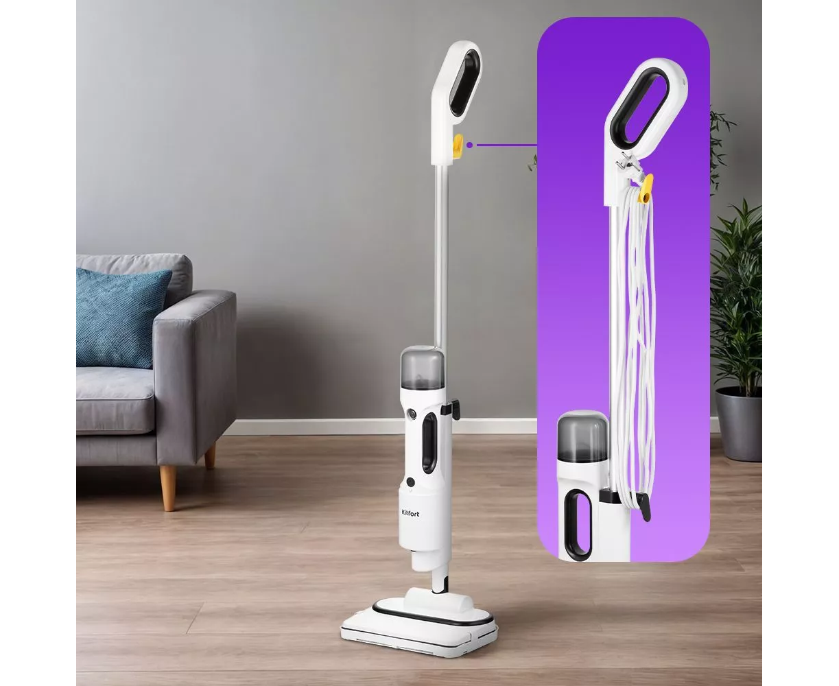 Паровая швабра обладает функцией вертикальной парковки. На удлинительной трубке предусмотрены держатели для шнура.