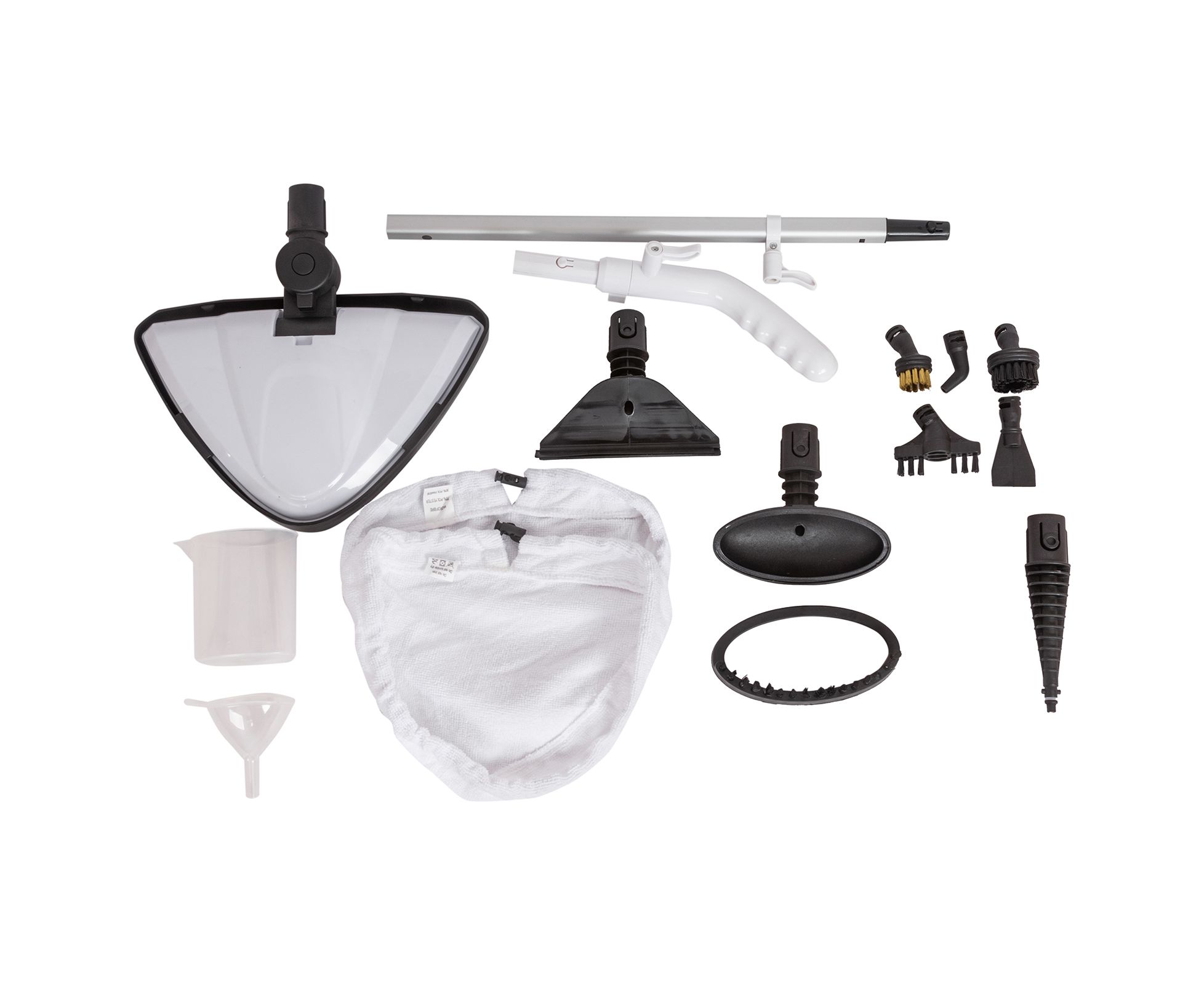 швабра, мерный стакан, воронка, насадка для очистки ковров, насадка из микрофибры для очистки пола, конусная насадка, металлическая щетка, нейлоновая щетка, насадка скребок, изогнутая насадка, насадка-щетка для очистки межплиточных швов, насадка для отпаривания, микрофибра для отпаривания, дополнительная щетка для отпаривания, насадка для окон, инструкция на русском языке