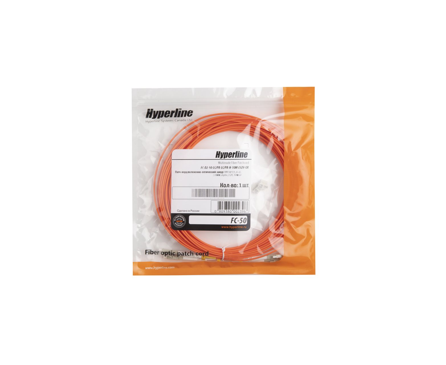 Патч-корд HYPERLINE FC-D2-50-LC/PR-LC/PR-H-10M-LSZH-OR волоконно-оптический MM 50/125, OM2, LC-LC, 2.0 мм, duplex, LSZH, 10 м (002396)