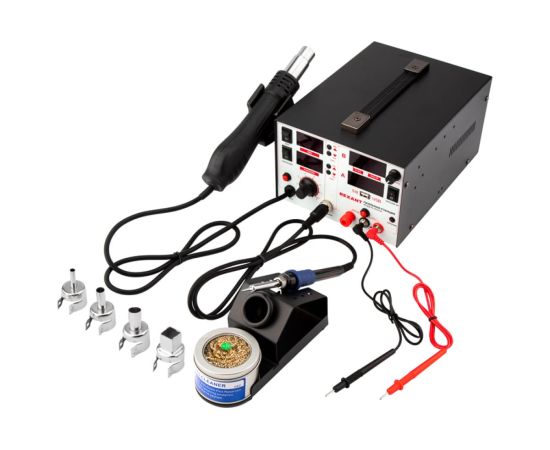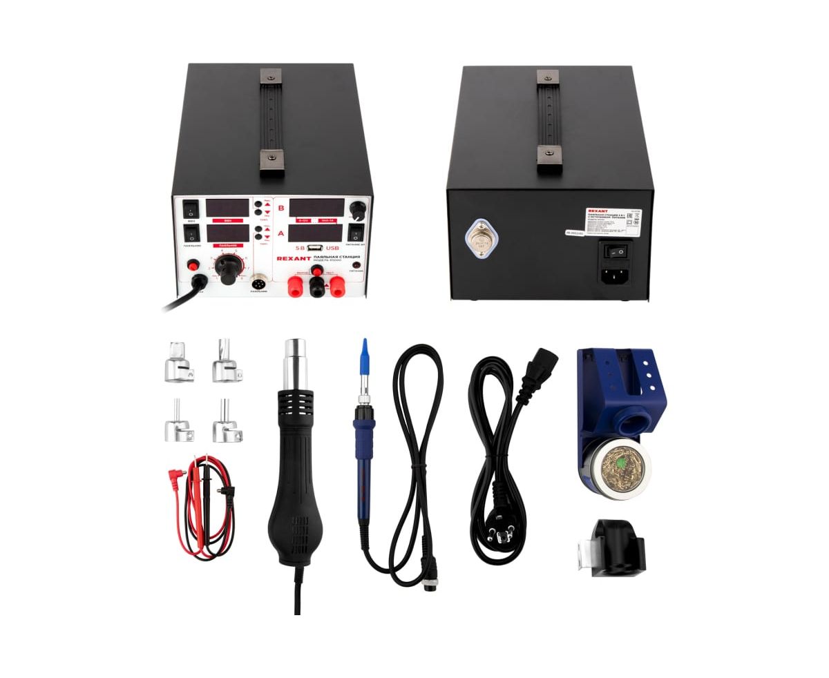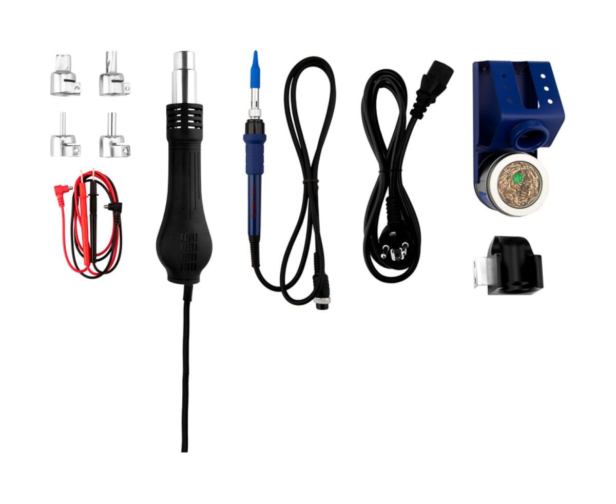 В комплектацию станции входят: основной блок, сетевой шнур, термофен, паяльник, держатель паяльника, держатель термофена, губка для очистки жала паяльника (в ложементе), 3 насадки для термофена разного размера, а также 1 пара проводов для БП.