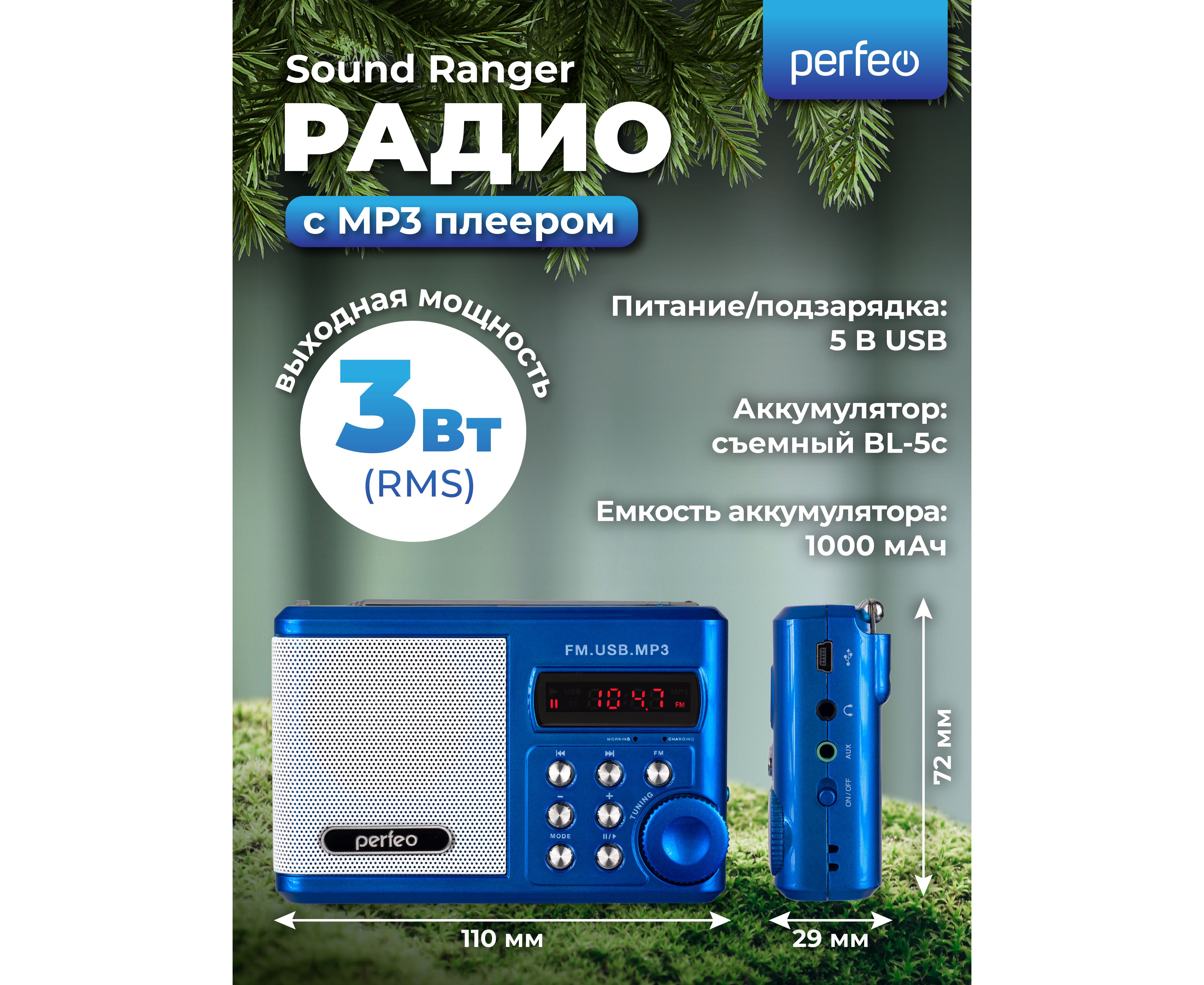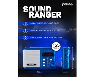 Радиоприемник цифровой Perfeo Sound Ranger, УКВ+FM, MP3 (USB/TF), USB-audio, BL-5C 1000mAh, синий (SV922BLU), (Арт. PF_3183)