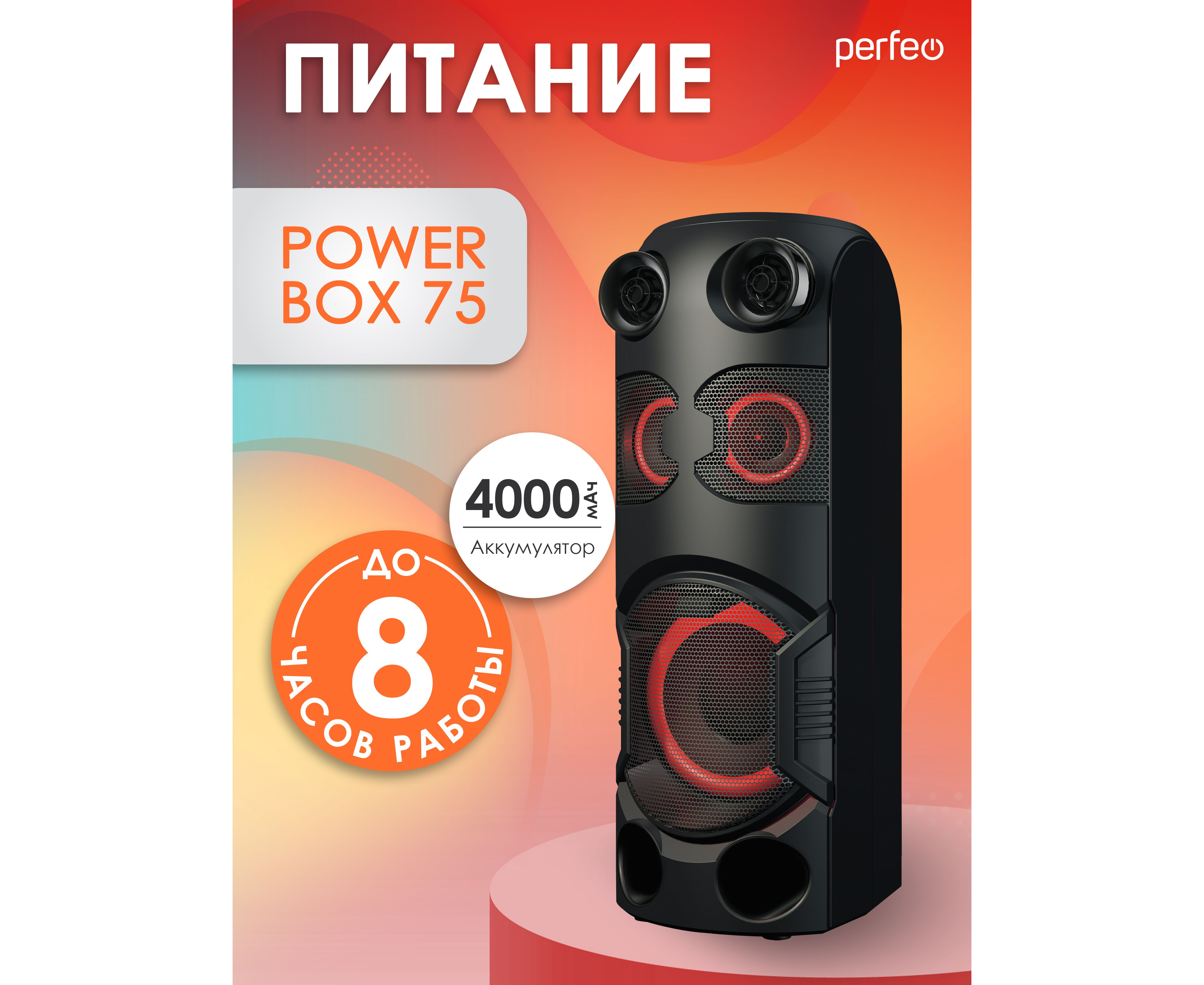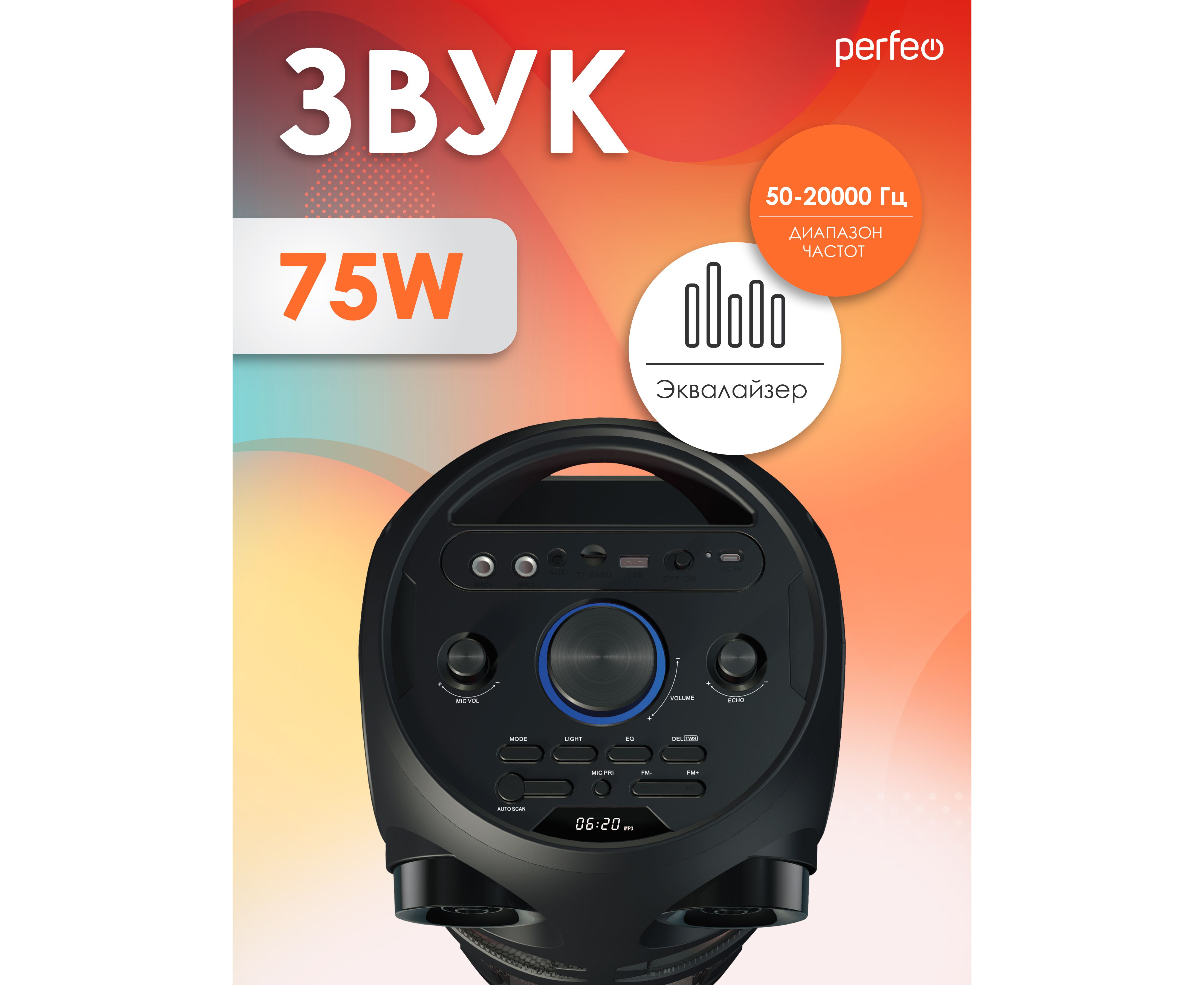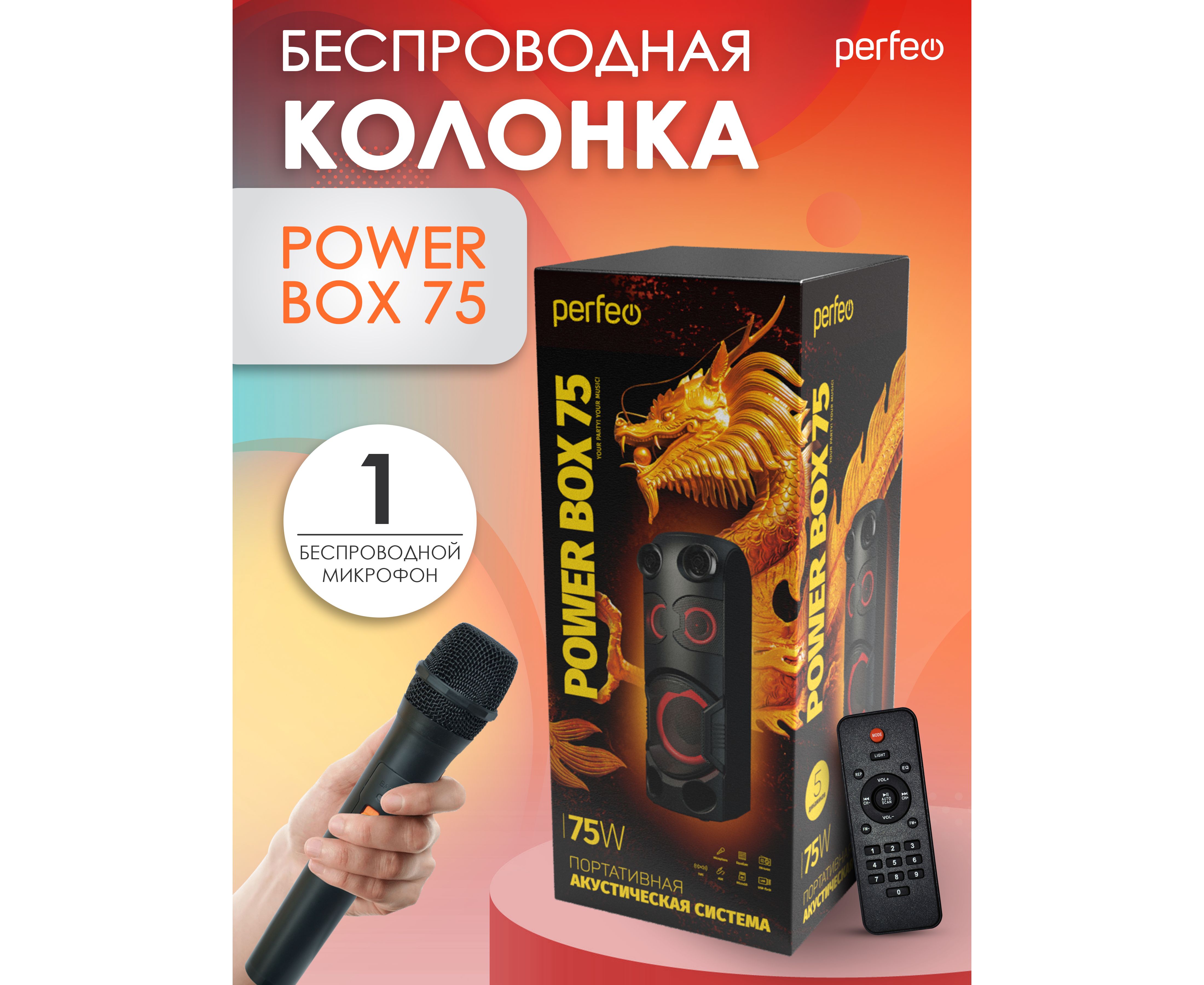 Perfeo портативная акустическая система ”Power Box 75” EQ, MP3 USB/microSD, AUX, FM, 2xMIC, TWS черная