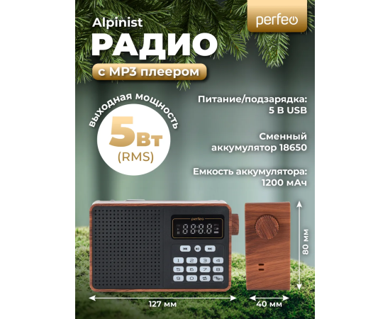 Радиоприемник цифровой Perfeo ALPINIST FM+ 70-108МГц/ MP3/ питание USB или 18650/ Коричневый, (Арт. PF_D0573)