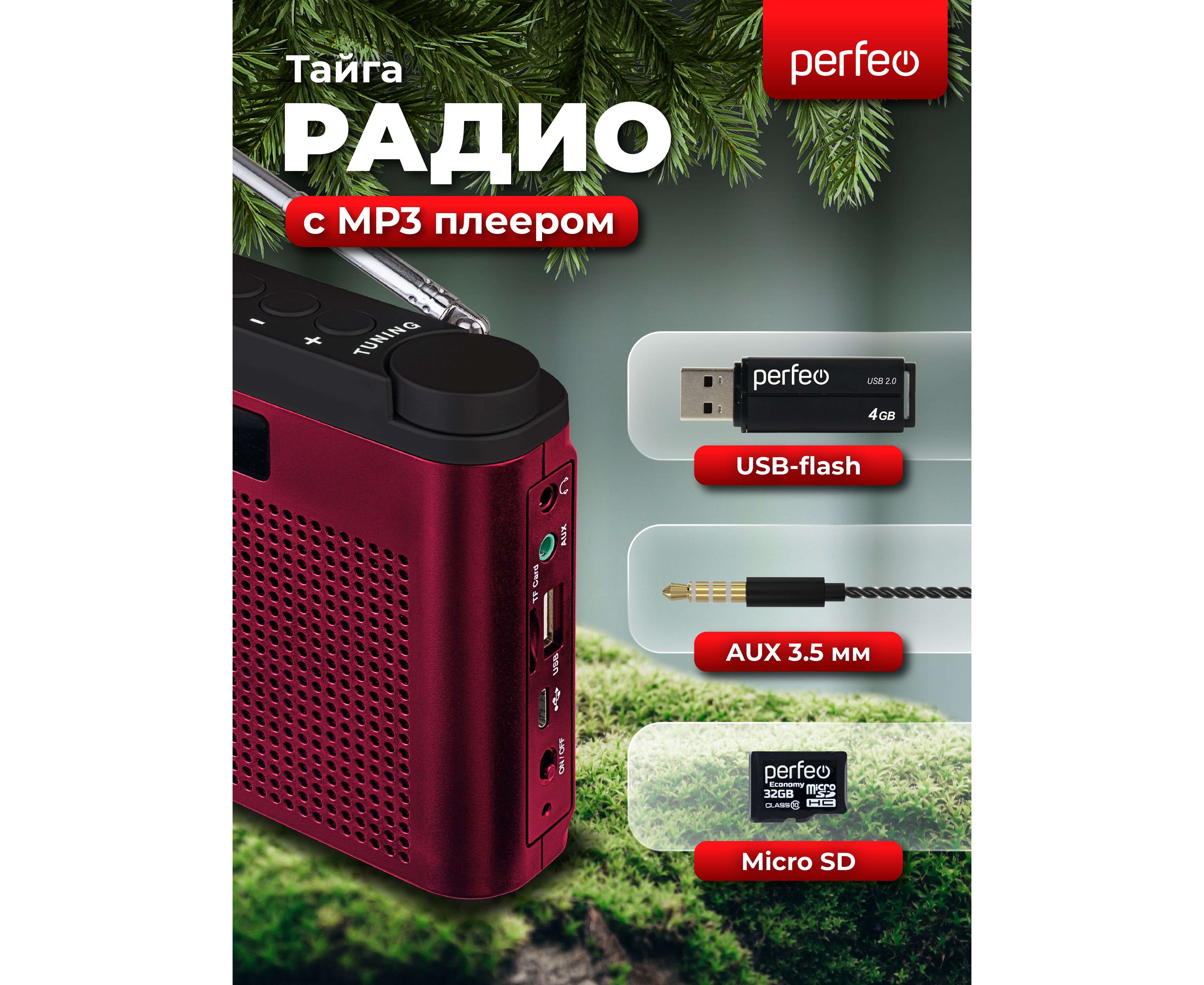 Портативный радиоприёмник УКВ/FM с разъемами USB и microSD. Perfeo "Тайга" создан на базе уже проверенного тюнера модели Perfeo SV922. Радиоприемник в классическом корпусе имеет стильный внешний вид, удобное колесико-регулятор радиоволны и кнопки управления на верхней грани устройства. Поворотная телескопическая антенна принимает сигнал в 2-х самых популярных диапазонах (УКВ и FM), также предусмотрена возможность выборочного запоминания 10 станций. Есть встроенный
