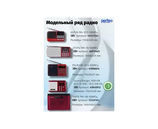 Радиоприемник от сети может работать через USB-адаптера (приобретается отдельно), варианты адаптеров приведены на фото к товару. В нашем ассортименте магазина Perfeo есть множество портативных радиоприемников, они станут отличным подарком для родителей, дедушек и бабушек, подарят хорошее настроение и станут украшением вашего интерьера, прекрасно впишутся в любой дизайн, как дома, так и на даче, незаменимы в походе. Радиоприемник легко зарядить от повербанка, он не прихотлив в использовании.