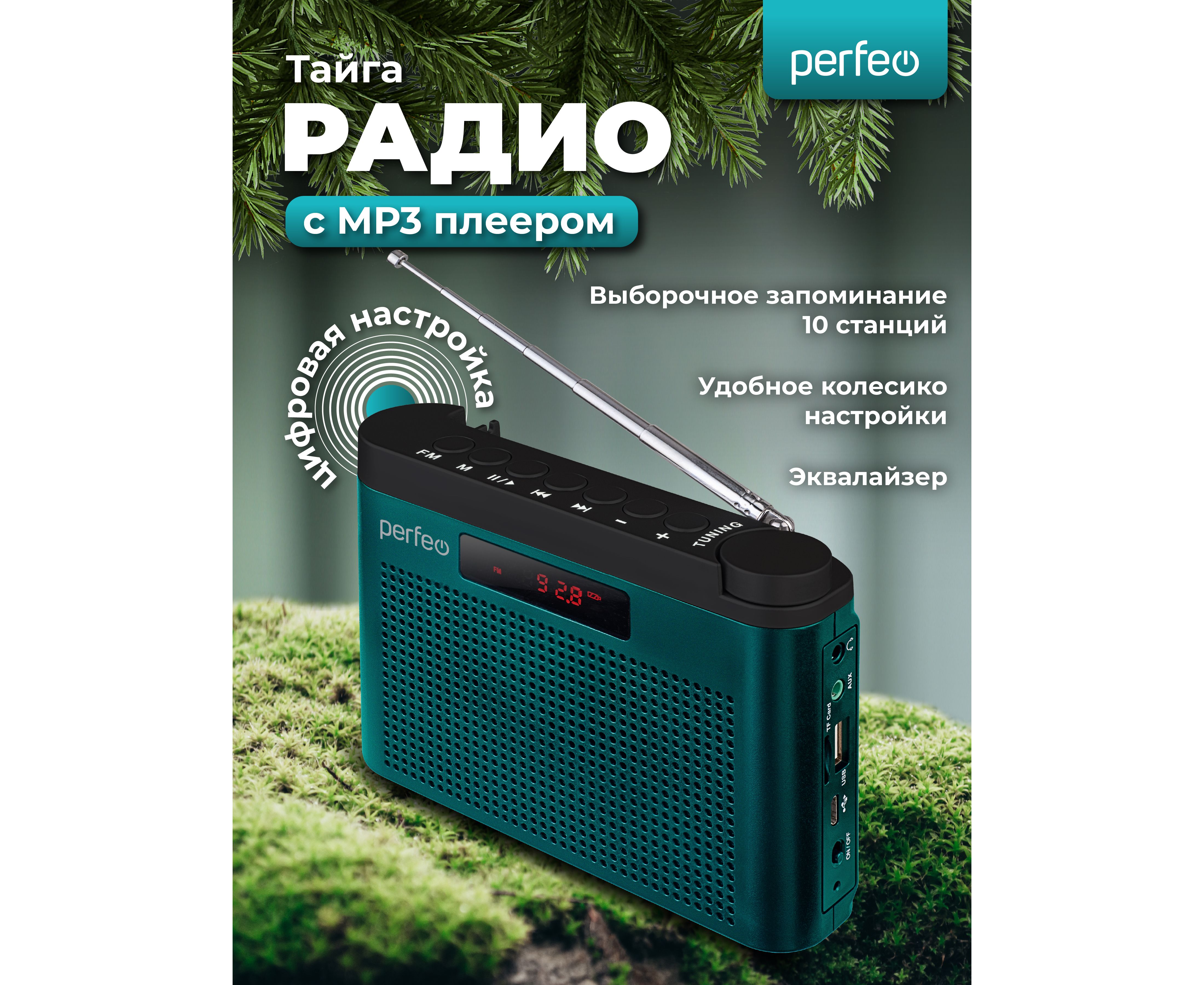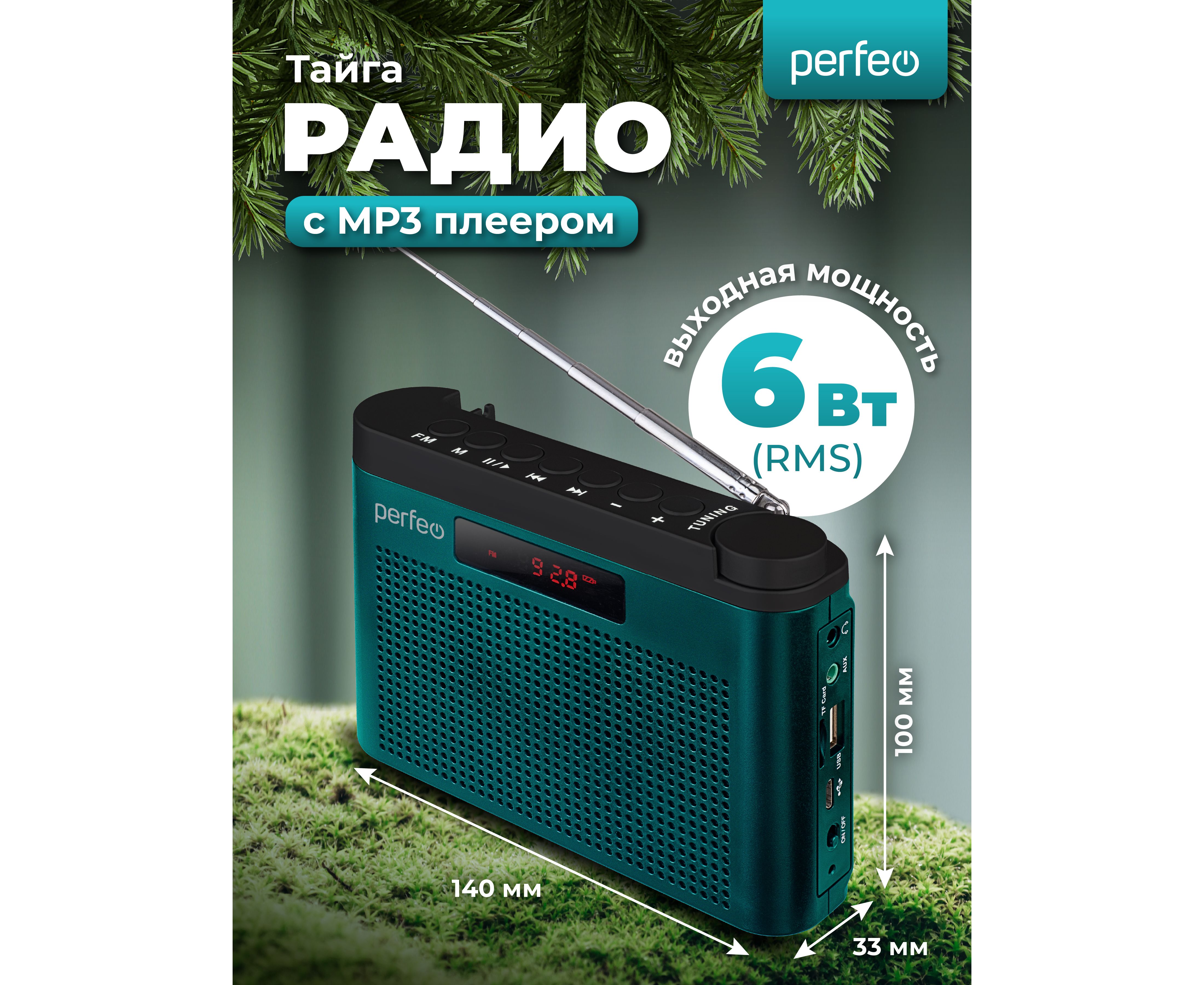 Портативный радиоприёмник УКВ/FM с разъемами USB и microSD. Perfeo "Тайга" создан на базе уже проверенного тюнера модели Perfeo SV922. Радиоприемник в классическом корпусе имеет стильный внешний вид, удобное колесико-регулятор радиоволны и кнопки управления на верхней грани устройства. Поворотная телескопическая антенна принимает сигнал в 2-х самых популярных диапазонах (УКВ и FM), также предусмотрена возможность выборочного запоминания 10 станций. Есть встроенный MP3-плеер, который воспроизводит MP3-файлы с карты памяти microSD или USB-накопителя. Аудиовход AUX, разъем для наушников и поддержка режима USB-аудио расширяют функционал приемника. За насыщенное звучание приемника и создание эффекта глубины звуковой сцены отвечают два активных 40мм динамика (RMS 6 Вт) и пассивный сабвуфер Bass Booster. Автономная работа осуществляется от встроенного аккумулятора 18650 (1800 мАч), зарядка от USB-порта (кабель mini USB - USB в комплекте). Радиоприемник от сети может работать через USB-адаптера (приобретается отдельно), варианты адаптеров приведены на фото к товару. В нашем ассортименте магазина Perfeo есть множество портативных радиоприемников, они станут отличным подарком для родителей, дедушек и бабушек, подарят хорошее настроение и станут украшением вашего интерьера, прекрасно впишутся в любой дизайн, как дома, так и на даче, незаменимы в походе. Радиоприемник легко зарядить от повербанка, он не прихотлив в использовании.