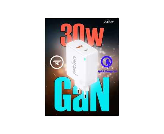Сетевое зарядное устройство с двумя разъемами PERFEO USB-A+TYPE-C, GaN, 30W, белый (I4653)