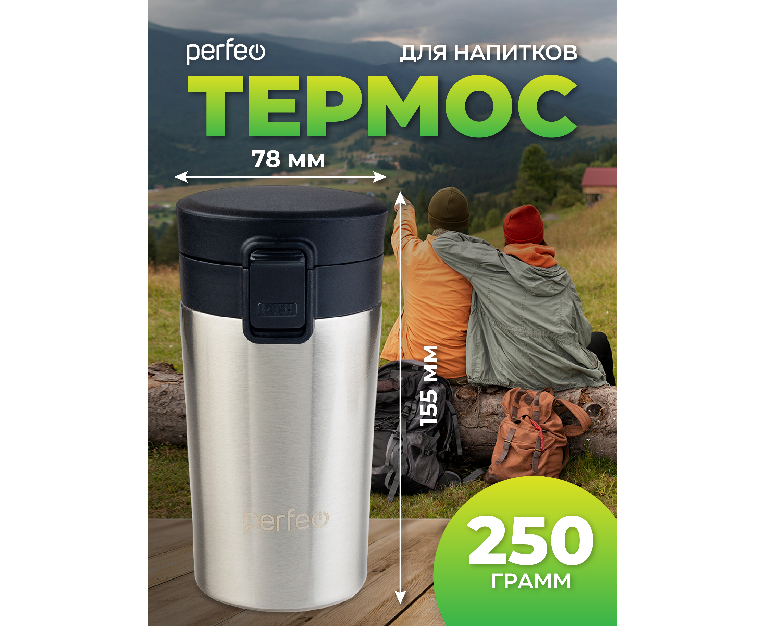 Термокружка для напитков PERFEO с крышкой-поилкой, ситечком, объем 0,25 л., нержавеющая сталь (PF_C3727)