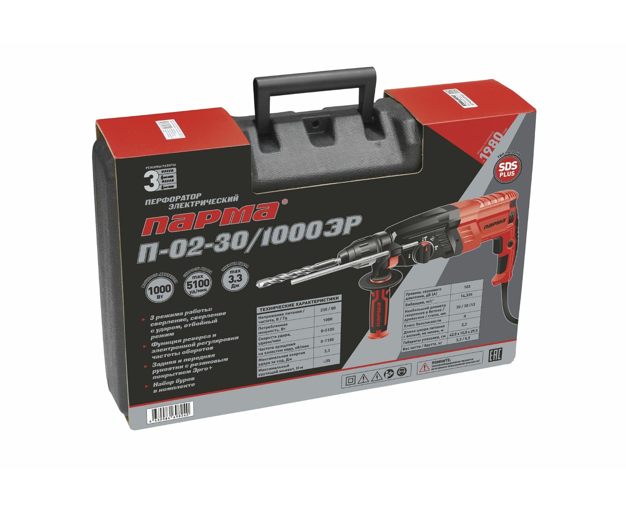 Перфоратор Парма П-02-30/1000ЭР 02.027.00009 – функциональная модель с тремя режимами работы: сверление, сверление с ударом, отбойный режим.